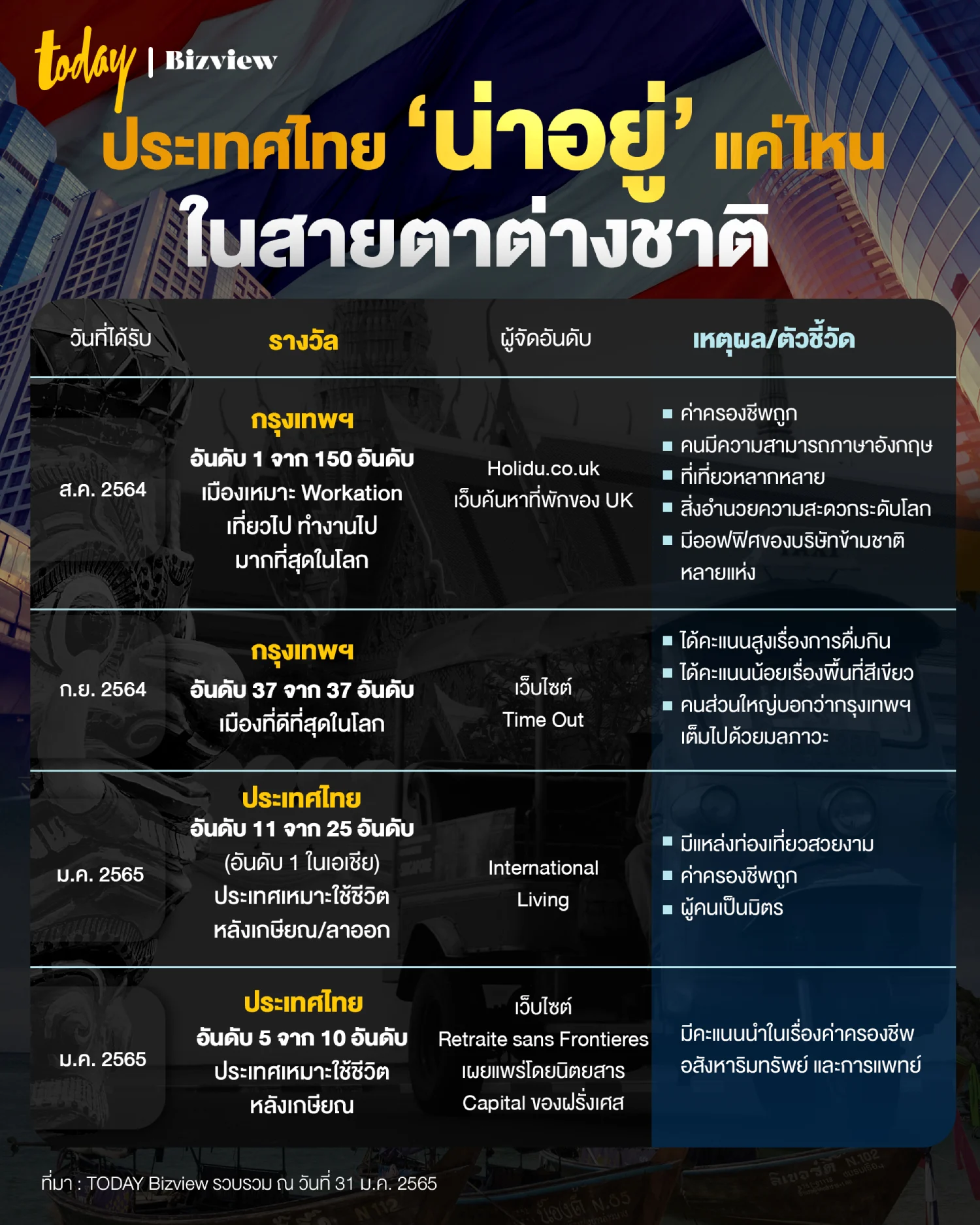 แต่ไม่ใช่เพียงแค่นี้เท่านั้น เพราะย้อนไปในช่วง 6 เดือนที่ผ่านมา ประเทศไทยและกรุงเทพมหานคร ติดอันดับเมืองน่าอยู่มาหลายครั้ง สะท้อนให้เห็นภาพลักษณ์ของประเทศไทยในสายตาของชาวต่างชาติ