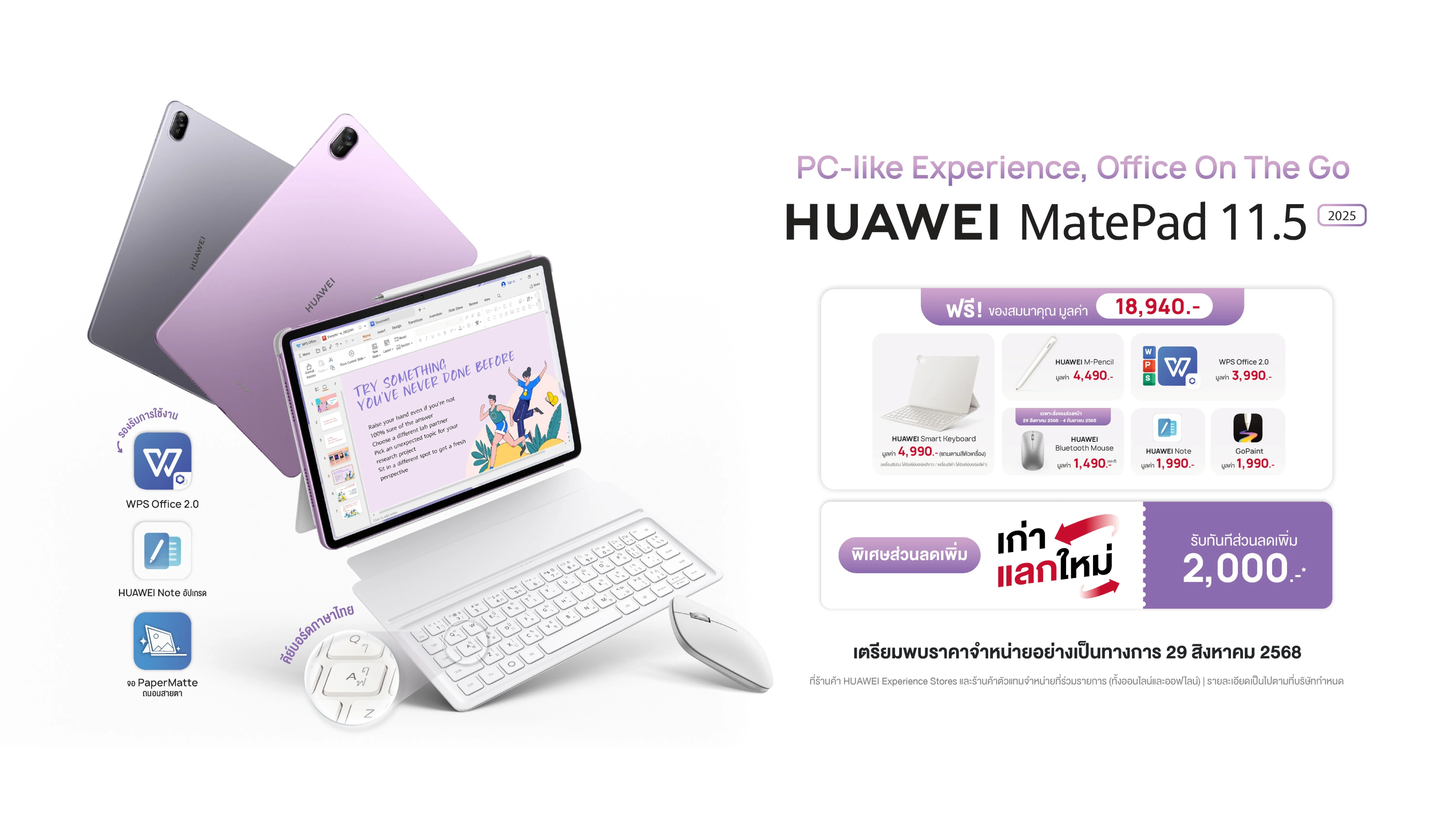 HUAWEI MatePad 11.5” 2025 จะเปิดราคาจำหน่ายอย่างเป็นทางการวันที่ 29 สิงหาคม 2568 นี้ โดยมีให้เลือก 2 สี ได้แก่ สีเทา Space Grey และสีม่วง พร้อมความคุ้มค่าสบายกระเป๋าในราคาประมาณ 10,000 บาท และพิเศษหากจองในช่วงพรีออเดอร์ ระหว่าง 29 สิงหาคม – 4 กันยายน 2568 รับไปเลยประสบการณ์ PC-like แบบครบเซ็ตในมูลค่ารวมทั้งหมด 18,940 บาท เช่น HUAWEI Smart Keyboard มูลค่า 4,990 บาท HUAWEI M-Pencil รุ่นที่ 3 มูลค่า 4,490 บาท และ HUAWEI Bluetooth Mouse มูลค่า 1,490 บาท นอกจากนี้ยังติดตั้งโปรแกรมให้ฟรี ได้แก่ PC-Level WPS Office มูลค่า 3,990 บาท HUAWEI Notes มูลค่า 1,990 บาท และ GoPaint มูลค่า 1,990 บาท พร้อมโปรโมชั่นเก่าแลกใหม่ที่มอบส่วนลดเพิ่มทันที 2,000 บาท เมื่อนำเครื่องเก่ามาแลก