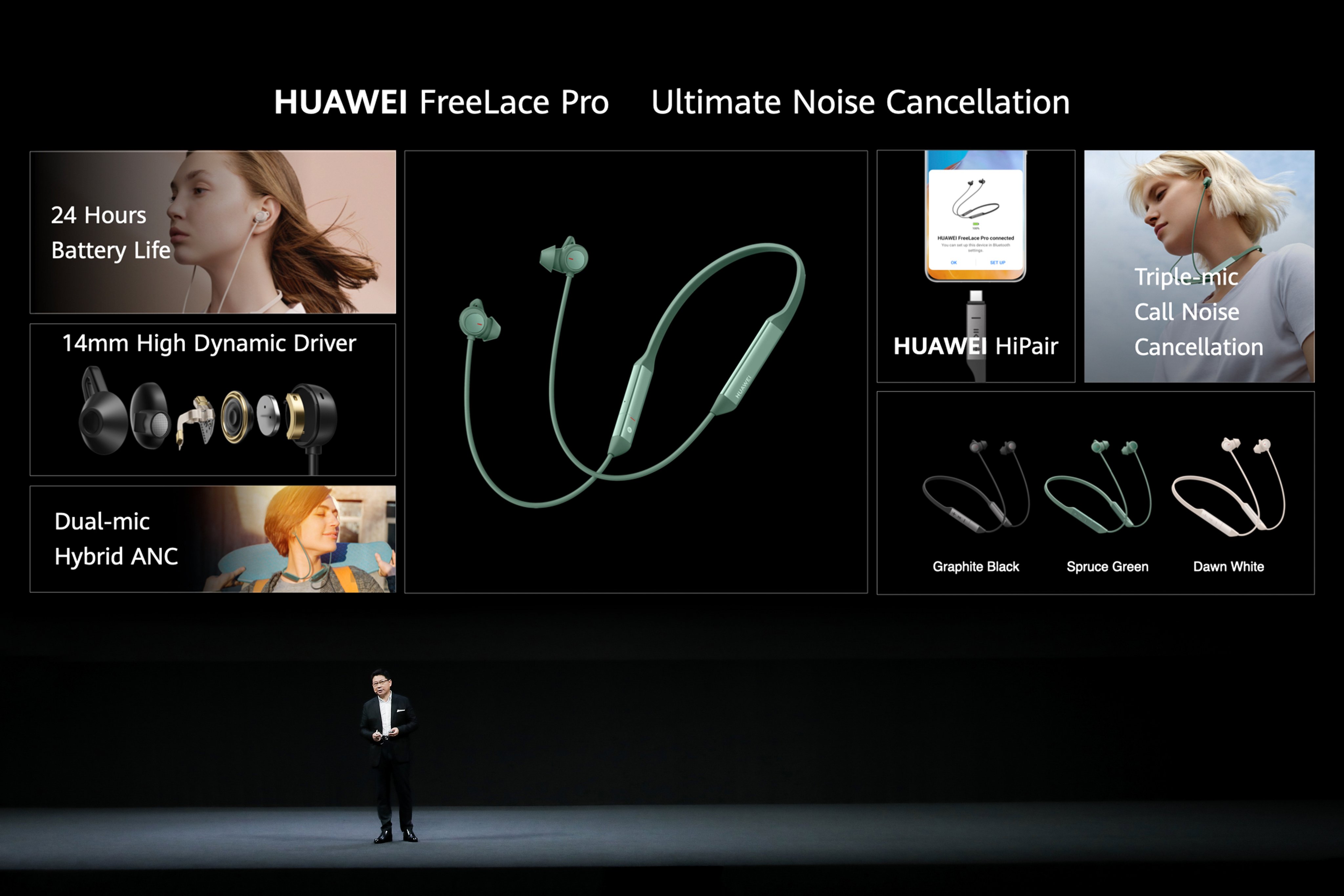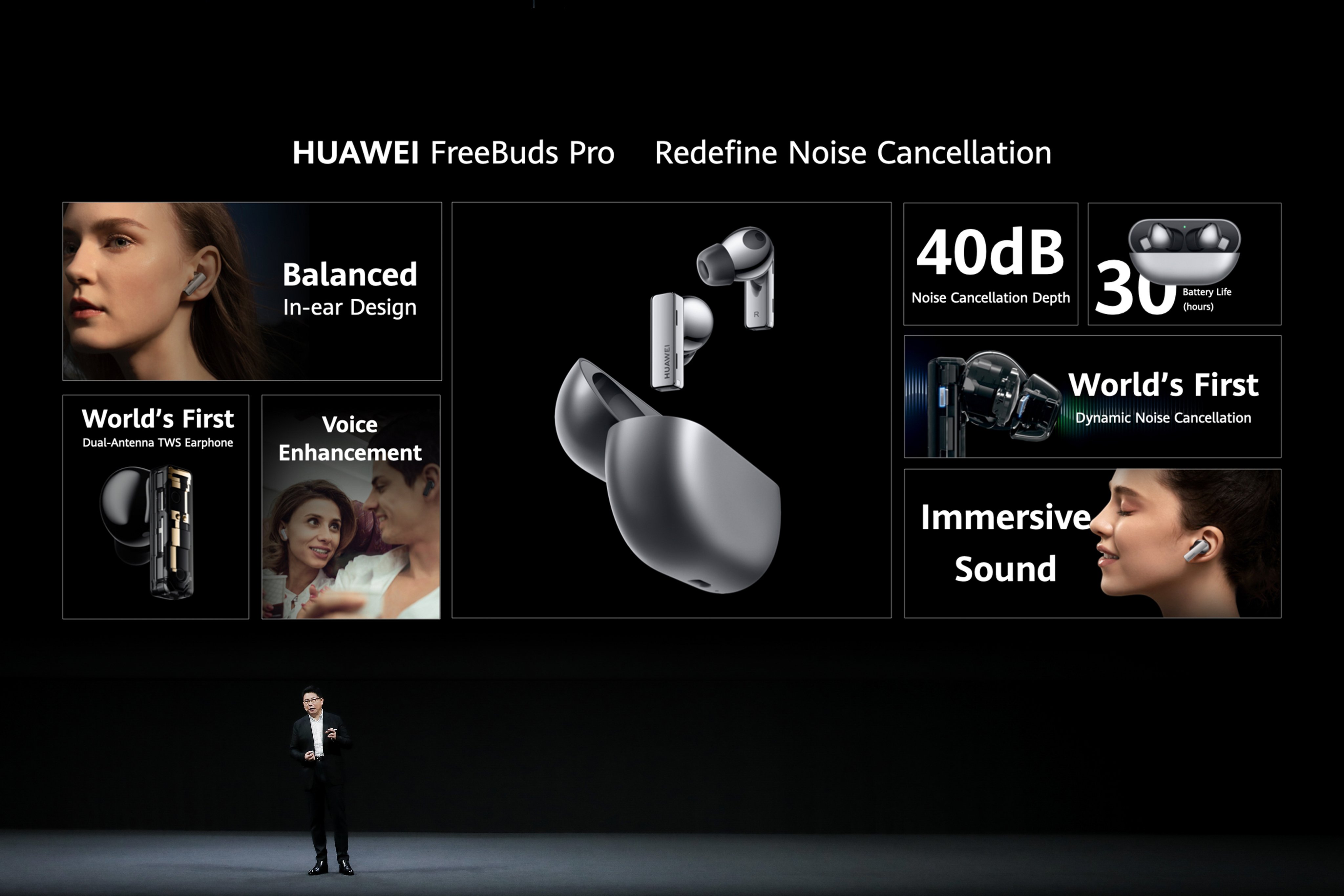 เริ่มจากหูฟัง True Wireless Stereo (TWS) รุ่น HUAWEI Free Buds Pro ที่มีรูปร่างเหมาะกับหู พร้อมระบบตัดเสียงลม สามารถคุยได้ชัดแม้อยู่ในที่ลมแรง และระบบตัดเสียงรบกวนที่ลดเสียงจากภายนอกได้ถึง 40 เดซิเบล เปิดตัวที่ราคา 199 ยูโร (7,490 บาท)
