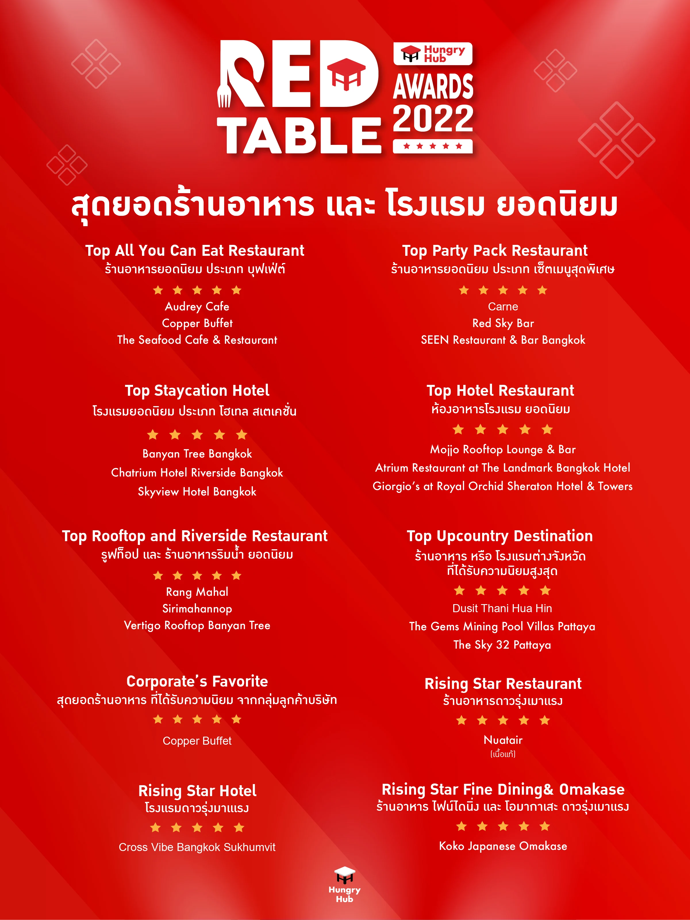 ดูรายละเอียดเพิ่มเติมได้ที่: https://business.hungryhub.com/news/hungry-hub-red-table-awards-2022/