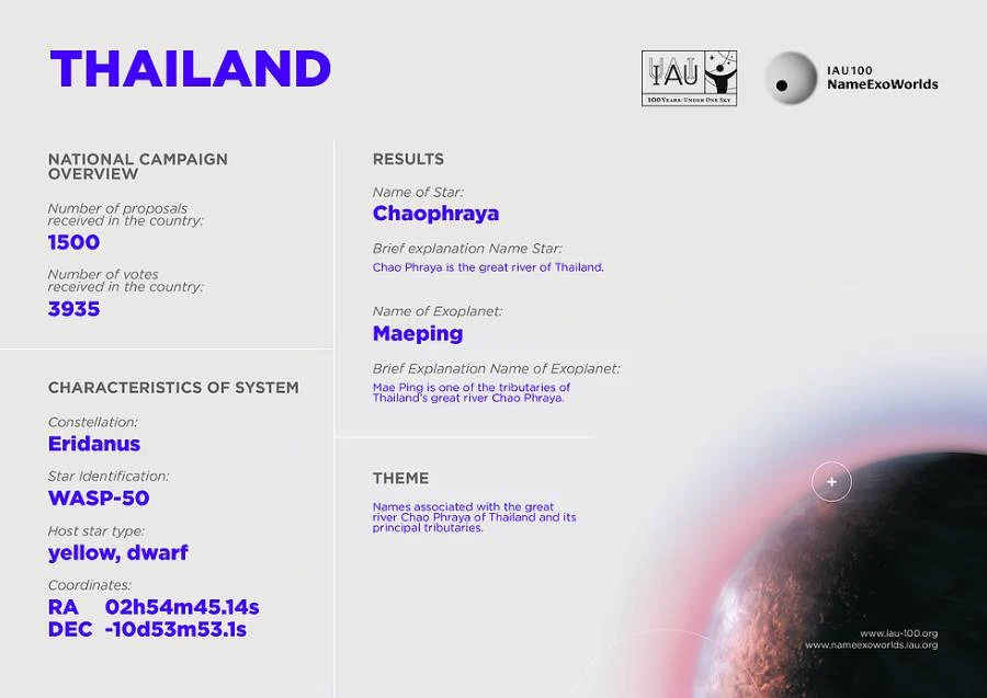 สมาคมดาราศาสตร์ไทย ระบุว่า ดาว WASP-50 ในกลุ่มดาวแม่น้ำ (Eridanus) เป็นดาวฤกษ์ดวงที่ 2 ที่มีชื่อเป็นภาษาไทยจากโครงการ NameExoWorlds โดยสหพันธ์ดาราศาสตร์สากล (IAU)