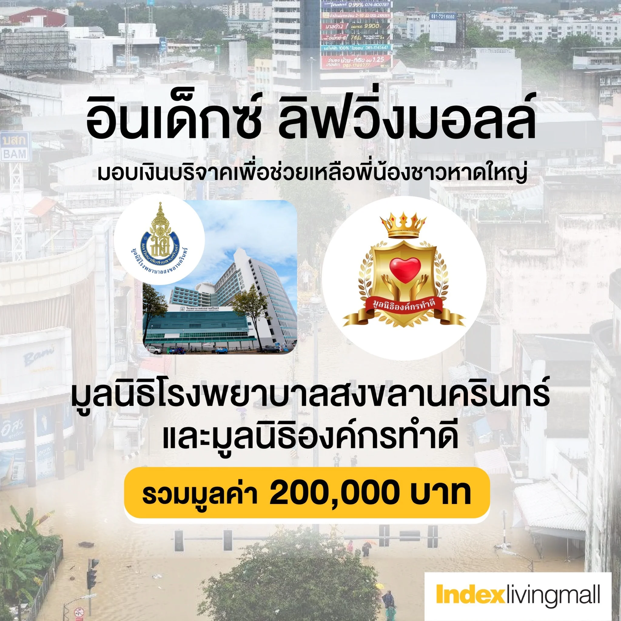 ทั้งนี้ เพื่อช่วยแบ่งเบาภาระอันหนักอึ้งของพี่น้องชาวหาดใหญ่ พร้อมกับร่วมคืนชีวิตให้ทุกคนและฟื้นฟูบ้านทุกหลัง ทั้งยังเป็นการประคับประคองผู้ประกอบการในพื้นที่หาดใหญ่และพื้นที่ใกล้เคียงในเขตภาคใต้ ที่ได้รับผลกระทบจากอุทกภัยให้กลับมาเข้มแข็งยืนหยัดได้อีกครั้ง รวมถึงน้ำใจจากทุกภาคส่วนที่หลั่งไหลมาช่วยพี่น้องชาวหาดใหญ่ในครั้งนี้ จะเป็นอีกแรงผลักดันให้ทุกคนมีความหวังและพลังใจที่จะสามารถกลับมายืนอย่างเข้มแข็งได้อีกครั้ง และไม่ว่าจะเจอวิกฤตชีวิตที่หนักแค่ไหนอยากให้เชื่อมั่นว่าทุกคนไม่ได้ยืนอยู่เพียงลำพัง พวกเราชาว อินเด็กซ์ ลิฟวิ่งมอลล์ จะร่วมช่วย ร่วมสู้ พร้อมส่งพลังใจให้กับทุกคน และจะช่วยทำให้ ‘บ้าน ซึ่งเป็นเซฟโซนที่ดีที่สุดสำหรับทุกคน’ กลับมามีชีวิตและอบอุ่นดังเดิม แล้วเราจะผ่านวิกฤตนี้ไปด้วยกันอย่างดีที่สุด”