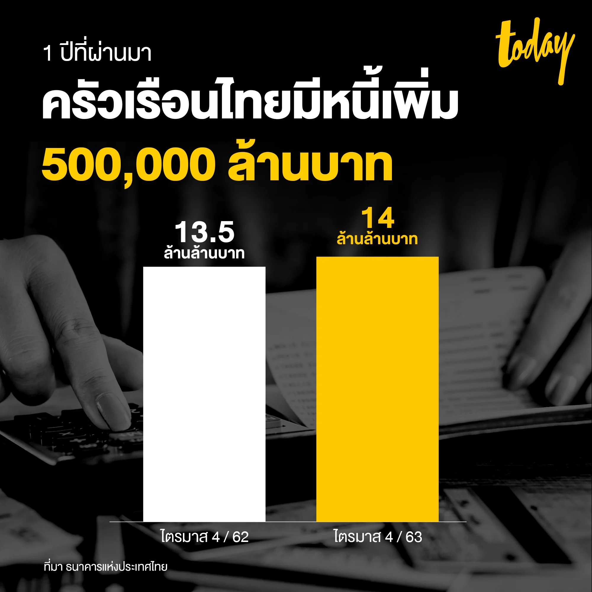ผลกระทบด้านเศรษฐกิจ ประชาชนจำนวนมากประสบกับภาวะ Income Shock หรือรายได้ลดลงอย่างกะทันหัน ส่งผลให้ความสามารถในการชำระหนี้ลดลงและมีหนี้สูงขึ้น ช่วง 1 ปีที่ผ่านมา ครัวเรือนไทยมีหนี้เพิ่มขึ้นประมาณ 500,000 ล้านบาท จาก 13,489,333 ล้านบาท (79.8% ต่อ GDP) ในไตรมาส 4 ปี 2562 กลายเป็น 14,020,730 ล้านบาท (89.3% ต่อ GDP) ในไตรมาส 4 ปี 2563