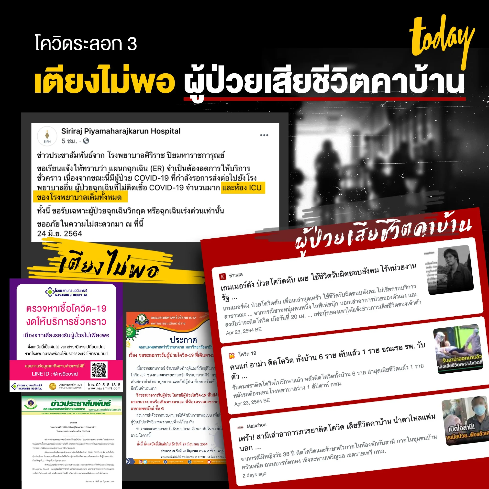 ในขณะที่โรงพยาบาลหลายแห่งออกมาประกาศงดตรวจหาเชื้อโควิดชั่วคราว เพราะเตียงเต็ม ไม่มีเตียงรองรับผู้ป่วย และไม่มีบุคลากรการแพทย์ดูแล ผู้ป่วยจึงต้องรอเตียงอยู่บ้านและบางรายเสียชีวิตที่บ้านของตนเอง