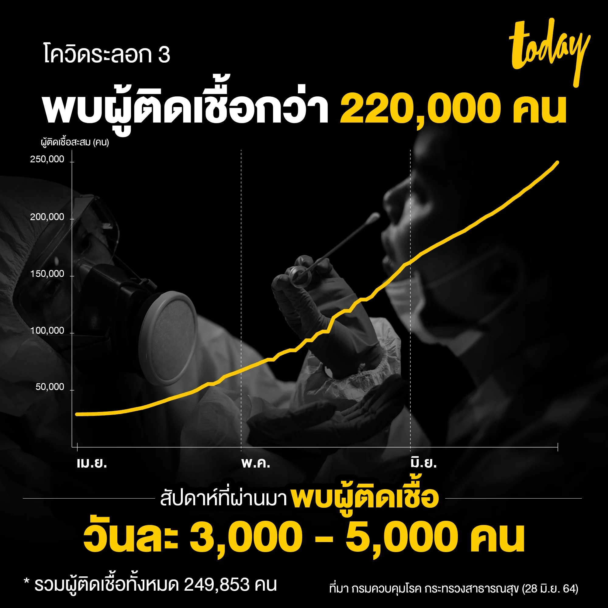 ตั้งแต่ต้นเดือน เม.ย. – 28 มิ.ย. 64 ไทยพบผู้ติดเชื้อโควิด-19 ในระลอก 3 แล้วกว่า 220,000 คน โดยสัปดาห์ที่ผ่านมาพบผู้ติดเชื้อใหม่วันละ 3,000 – 5,000 คน รวมพบผู้ติดเชื้อทั้งหมด 249,853 คน นับตั้งแต่โควิด-19 เริ่มระบาดในไทย