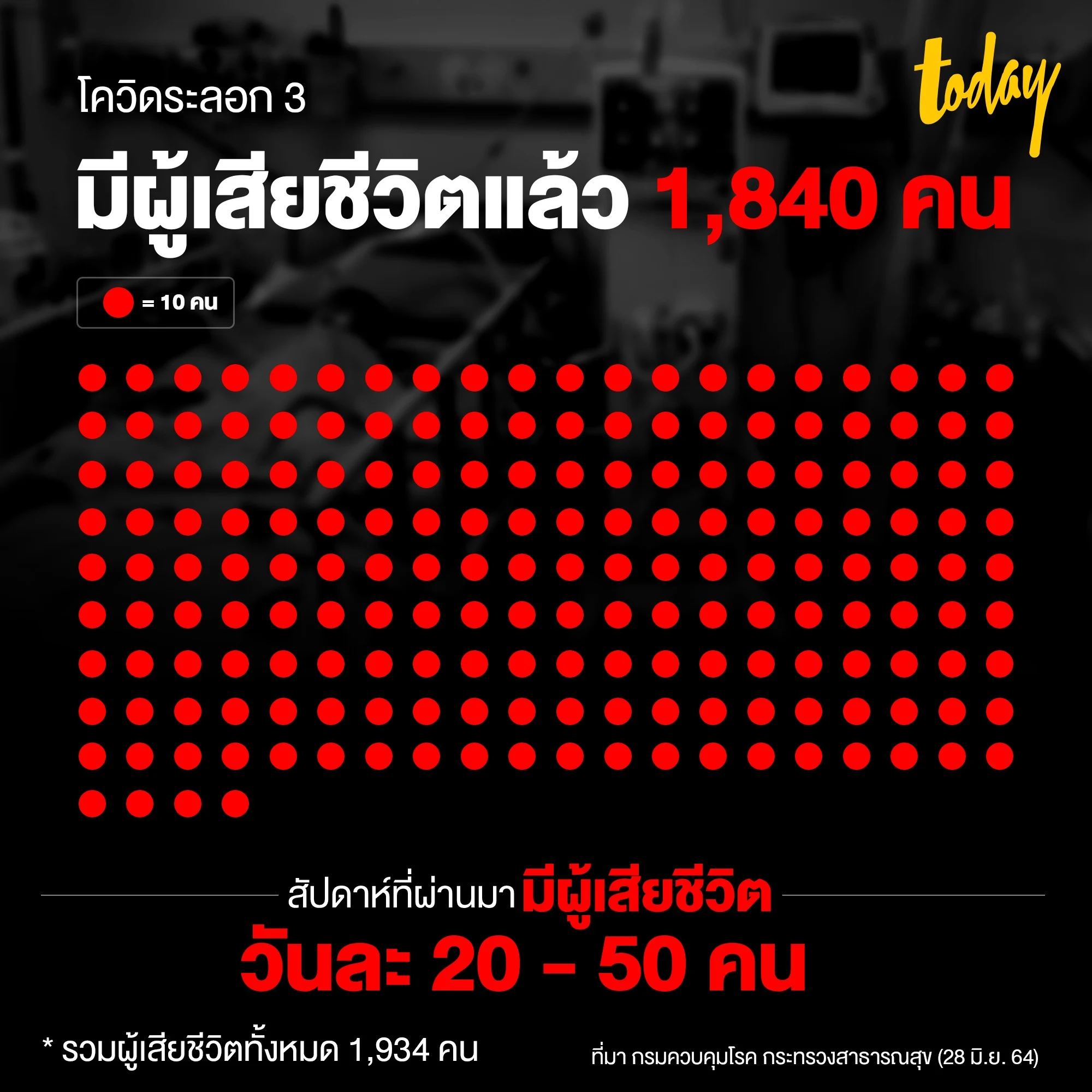 จำนวนผู้เสียชีวิตจากโควิดระลอก 3 อยู่ที่ 1,840 คน (1 เม.ย. – 28 มิ.ย. 64) โดยเฉพาะสัปดาห์ที่ผ่านมามีผู้เสียชีวิตวันละ 20 – 50 คน