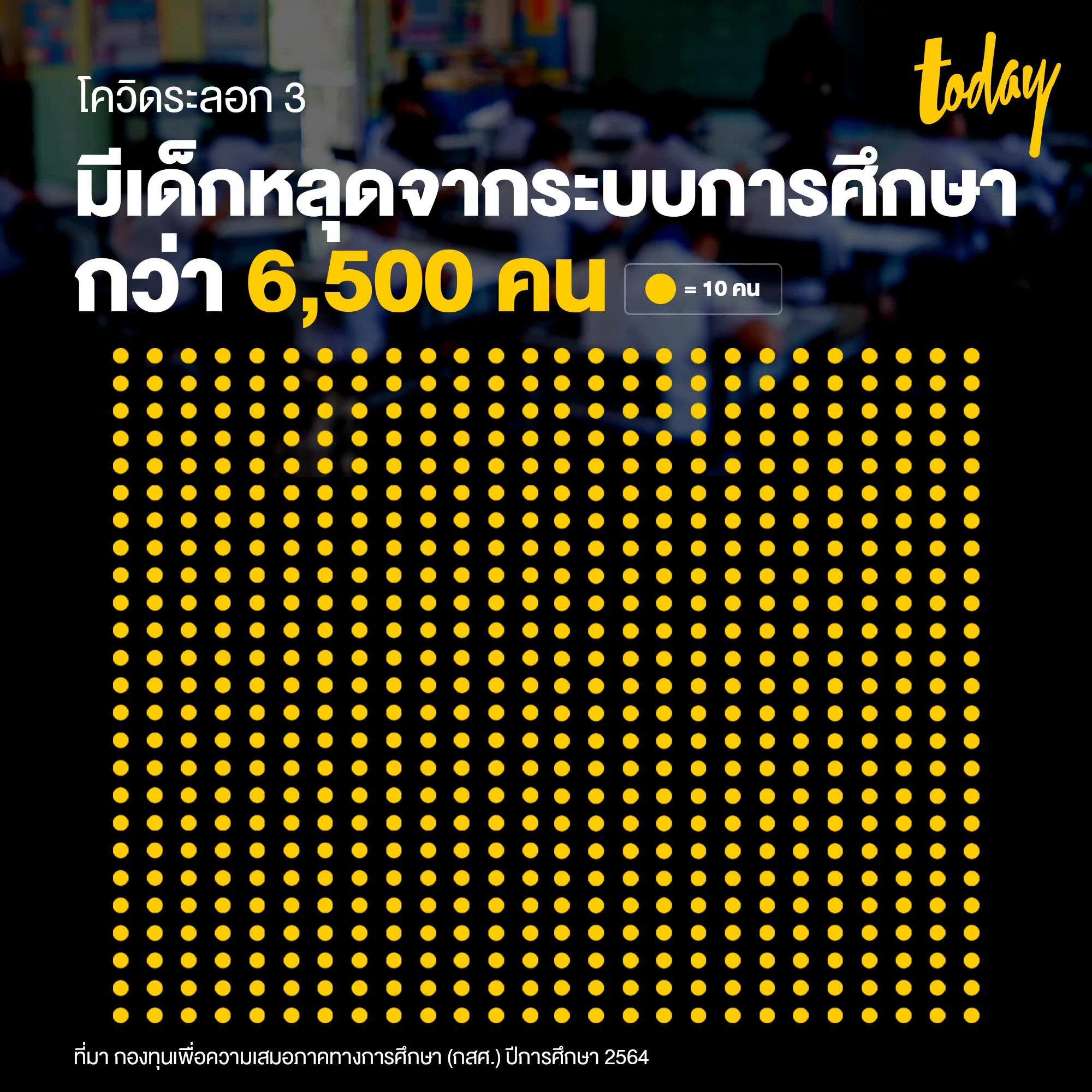 ผลกระทบด้านการศึกษา กองทุนเพื่อความเสมอภาคทางการศึกษา (กสศ.) ระบุว่าปีการศึกษา 2564 มีเด็กหลุดจากระบบการศึกษาแล้ว 6,568 คน พบหลายครอบครัวยากจนเฉียบพลัน และคาดว่าสิ้นปีการศึกษา 2564 จะมีเด็กหลุดจากระบบการศึกษากว่า 65,000 คน แบ่งเป็น