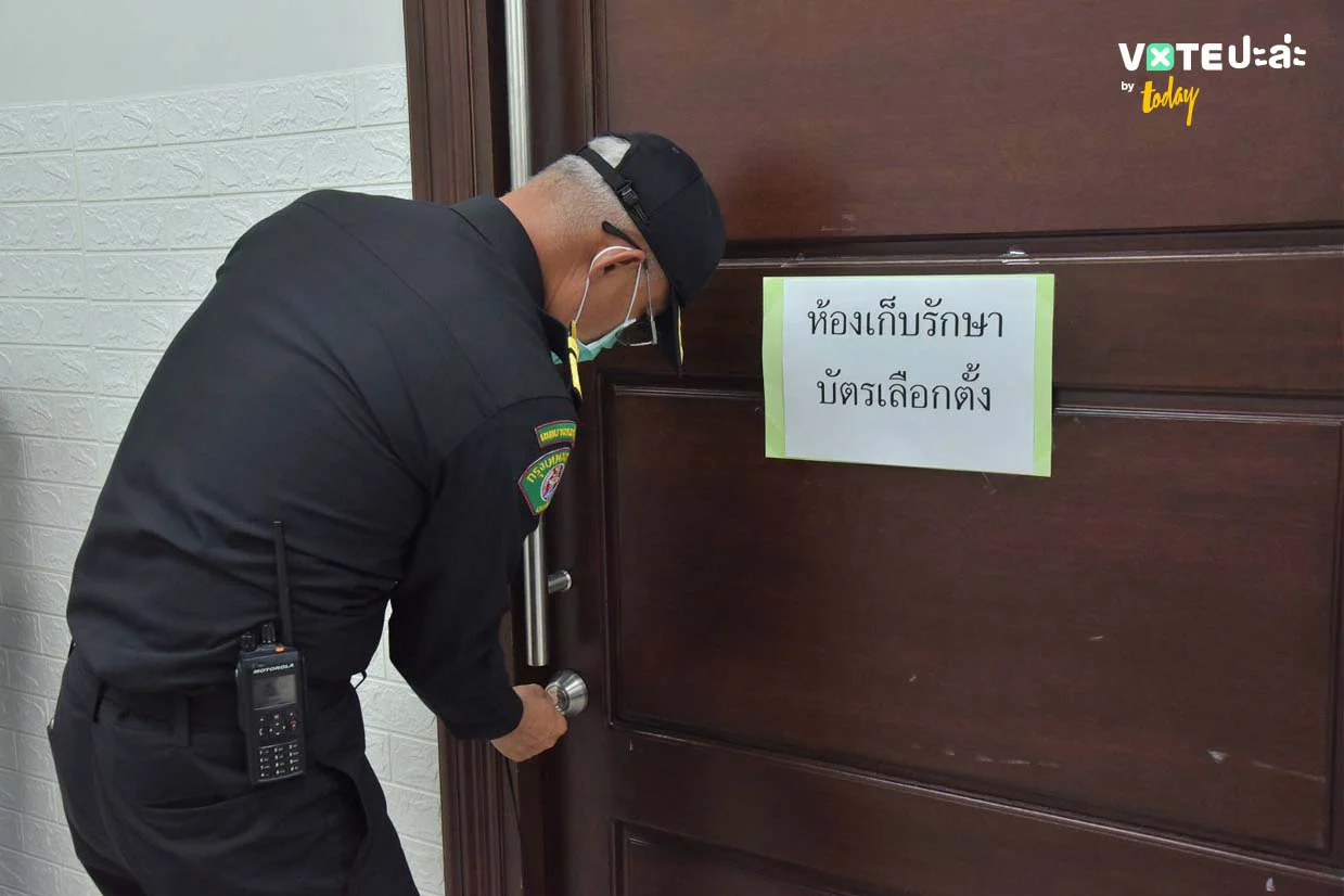 ห้องเก็บรักษาบัตรเลือกตั้ง ติดตั้งกล้อง CCTV และจัดพนักงานรักษาความปลอดภัย 3 ผลัด ตลอด 24 ชั่วโมง ในภาพนี้คือที่เขตบางกอกน้อย