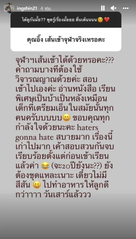 “จุฬาฯ เส้นเข้าได้เหรอคะ คำถามบางทีต้องใช้วิจารณญาณด้วยค่ะ สอบเข้าไปเองค่ะ อ่านหนังสือ เรียนพิเศษเป็นบ้าเป็นหลัง เหมือนเด็นที่เตรียมเอ็นในสมัยนั้นทุกคนครับ ขอบคุณทุกกำลังใจด้วยนะคะ haters gonna hate สบายมาก เรื่องนี้เก่าไปมาก เค้าสอบสวนกันจบเรียบร้อย ตั้งแต่ก่อนเข้าเรียนแล้วค่า (จะ20ปียังนะ) ยังต้องขุดแหละเนาะ เดี๋ยวไม่มีสีสัน ไปทำอาหารให้ลูกกว่า วันเสาร์แล้ว”