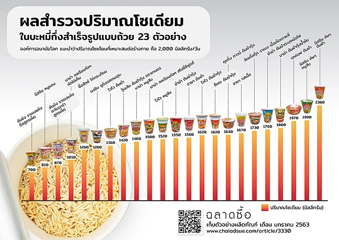 ก่อนหน้านี้มูลนิธิเพื่อผู้บริโภค ได้เผยข้อมูลจากนิตยสารฉลาดซื้อทำการสุ่มเก็บตัวอย่างผลิตภัณฑ์บะหมี่กึ่งสำเร็จรูปแบบถ้วยจำนวน 23 ตัวอย่างเพื่อนำมาสำรวจปริมาณโซเดียมจากข้อมูลบนฉลาก จากการสำรวจ พบว่า บะหมี่กึ่งสำเร็จรูปนั้นมีปริมาณโซเดียมสูงแตกต่างตามยี่ห้อและรสชาติ ผู้บริโภคควรพิจารณาดูปริมาณโซเดียมบนฉลากประกอบด้วย