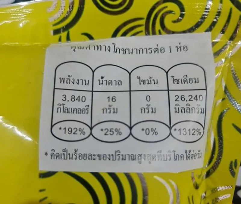 โซเชียลแชร์พบบะหมี่กึ่งสำเร็จรูปนำเข้ามีโซเดียมสูงถึง 26,240 มิลลิกรัม กรมอนามัยเตือนกินมากเสี่ยงไตพัง ความดันสูง และหัวใจวาย ขณะที่มูลนิธิเพื่อผู้บริโภคเคยสุ่มตรวจบะหมี่โซเดี่ยมสูง 23 ตัวอย่างเกินกว่าที่องค์การอนามัยโลกแนะนำ