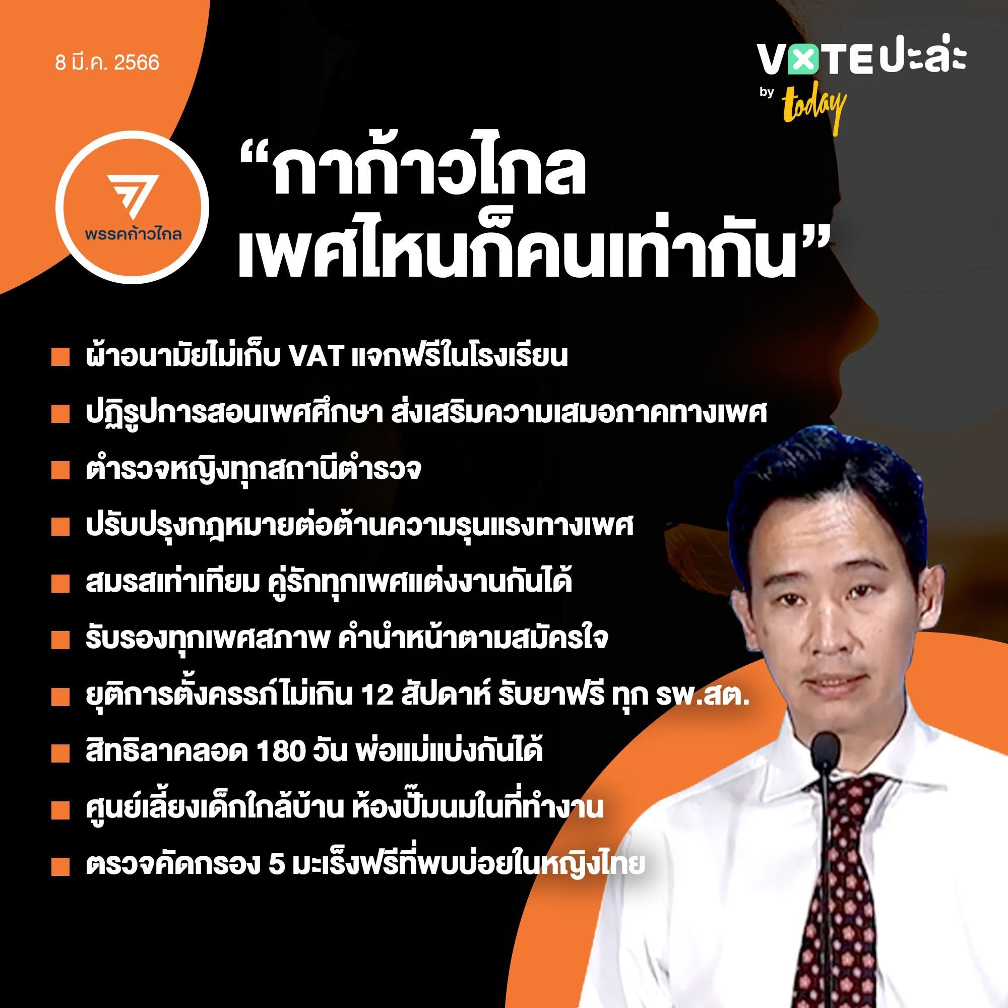 นายพิธา ลิ้มเจริญรัตน์ หัวหน้าพรรคก้าวไกล กล่าวเปิดตัวนโยบายเพื่อความเท่าเทียมทางเพศ ยืนยันพร้อมสานต่อภารกิจของพรรคอนาคตใหม่ ในการสร้างประเทศไทยที่ ‘คนไทยเท่าเทียมกัน ประเทศไทยเท่าทันโลก’ โดย 10 นโยบายเพื่อความเท่าเทียมทางเพศของพรรคก้าวไกล ซึ่งเรียงตามช่วงอายุของคนคนหนึ่งตั้งแต่เกิดจนแก่ ประกอบด้วย