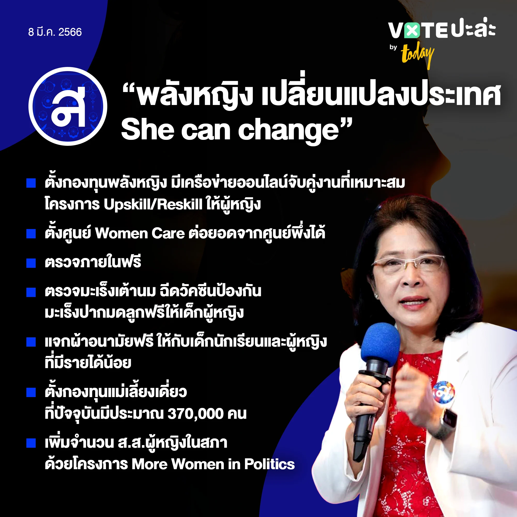 – สร้างสุขภาพที่ดีให้ผู้หญิง ในนโยบาย 30 บาท Plus ของพรรค จะมีการตรวจภายในฟรี ตรวจมะเร็งเต้านม ฉีดวัคซีนป้องกันมะเร็งปากมดลูกฟรีให้เด็กผู้หญิง