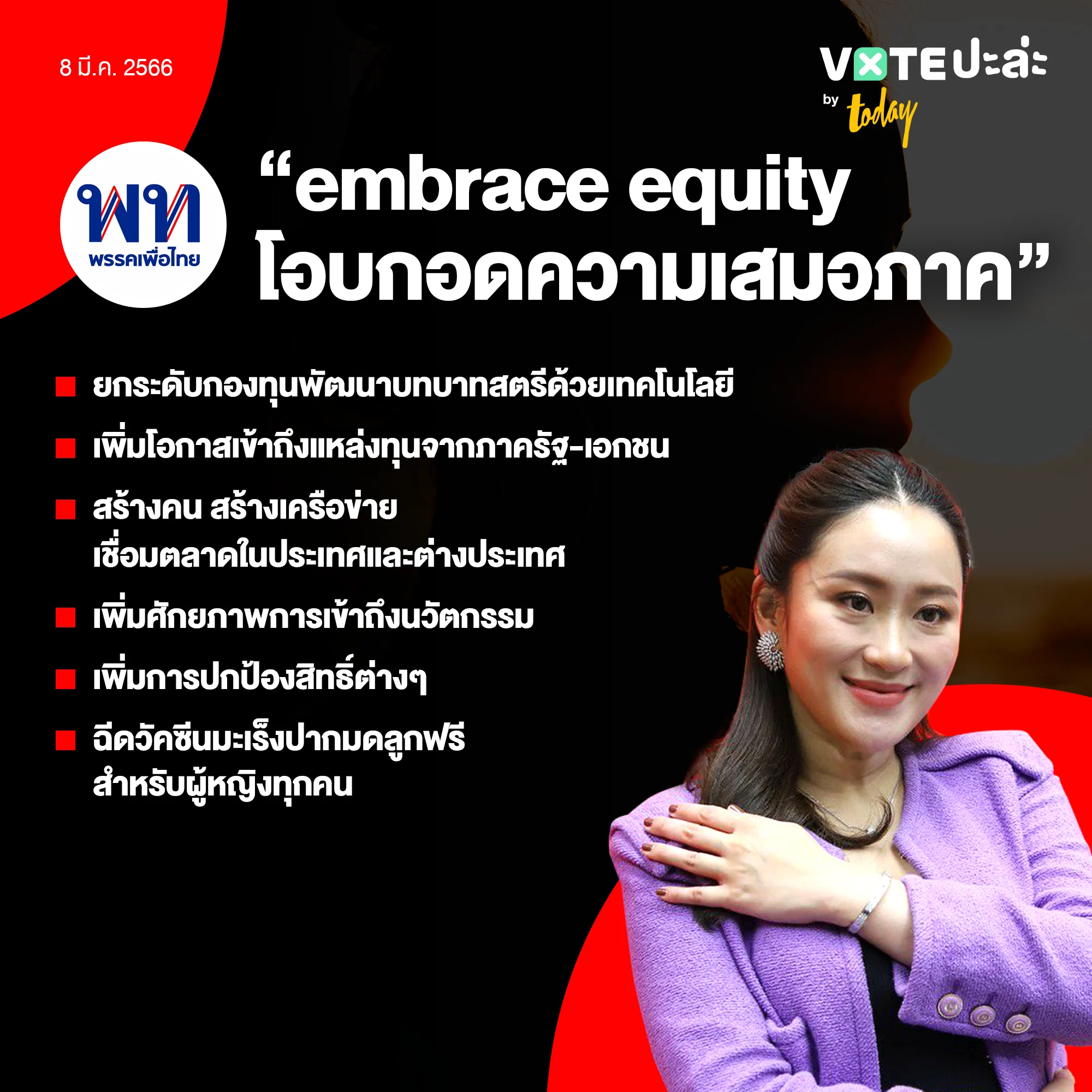 น.ส.แพทองธาร ชินวัตร ประธานคณะที่ปรึกษาด้านการมีส่วนร่วมและนวัตกรรม พรรคเพื่อไทย และหัวหน้าครอบครัวเพื่อไทย นำแถลงข่าวนโยบายเพื่อผู้หญิง เนื่องในวันสตรีสากล ณ พรรคเพื่อไทย ภายใต้ธีม “DigitALL: Innovation and technology for gender equality นวัตกรรมและเทคโนโลยีเพื่อความเท่าเทียมทางเพศ” โดยผู้เข้าร่วมสวมเสื้อ “embrace equity โอบกอดความเสมอภาค” เพื่อแสดงจุดยืนความเสมอภาคทางเพศของพรรคเพื่อไทย