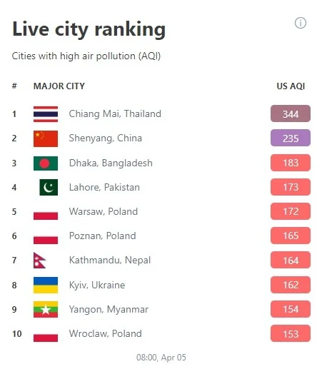 รองลงมาอยู่อันดับ 2 คือเมือง เสิ่นหยาง ประเทศจีน ดัชนีคุณภาพอากาศวัดได้ 226 US AQI ค่าฝุ่น PM 2.5 สูง 176 มคก./ลบ.ม. (µg/m3) ปรากฏแถบสีม่วง อยู่ในระดับอันตรายต่อสุขภาพ และอันดับ 3 คือเมืองธากา, บังคลาเทศ ดัชนีคุณภาพอากาศวัดได้ 183 US AQI ค่าฝุ่น PM 2.5 สูง 117.9 มคก./ลบ.ม. (µg/m3) ปรากฏแถบสีแดง อยู่ในระดับส่งผลกระทบต่อสุขภาพ