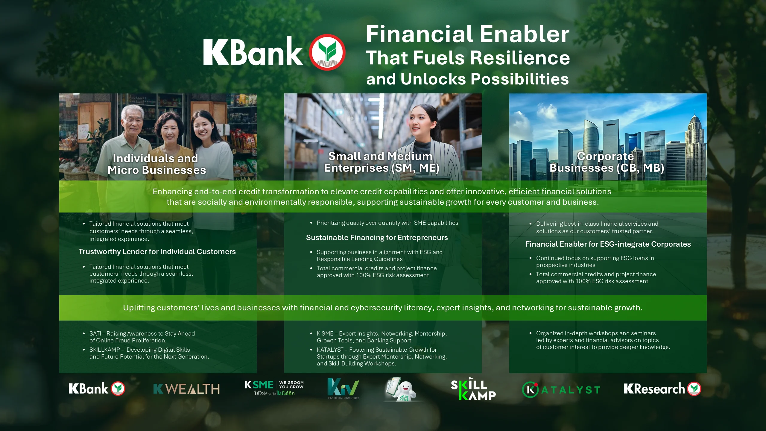 ไม่ใช่แค่การให้เงินทุน KBank ยังส่งมอบ องค์ความรู้และเครื่องมือ ที่จำเป็นต่อการเติบโตอย่างยั่งยืนให้แก่ลูกค้า ธุรกิจ และสังคม โดยที่ผ่านมาสามารถส่งมอบโซลูชันทางการเงินและการลงทุนไปสู่กลุ่มเป้าหมายได้ในหลากหลายรูปแบบ เช่น