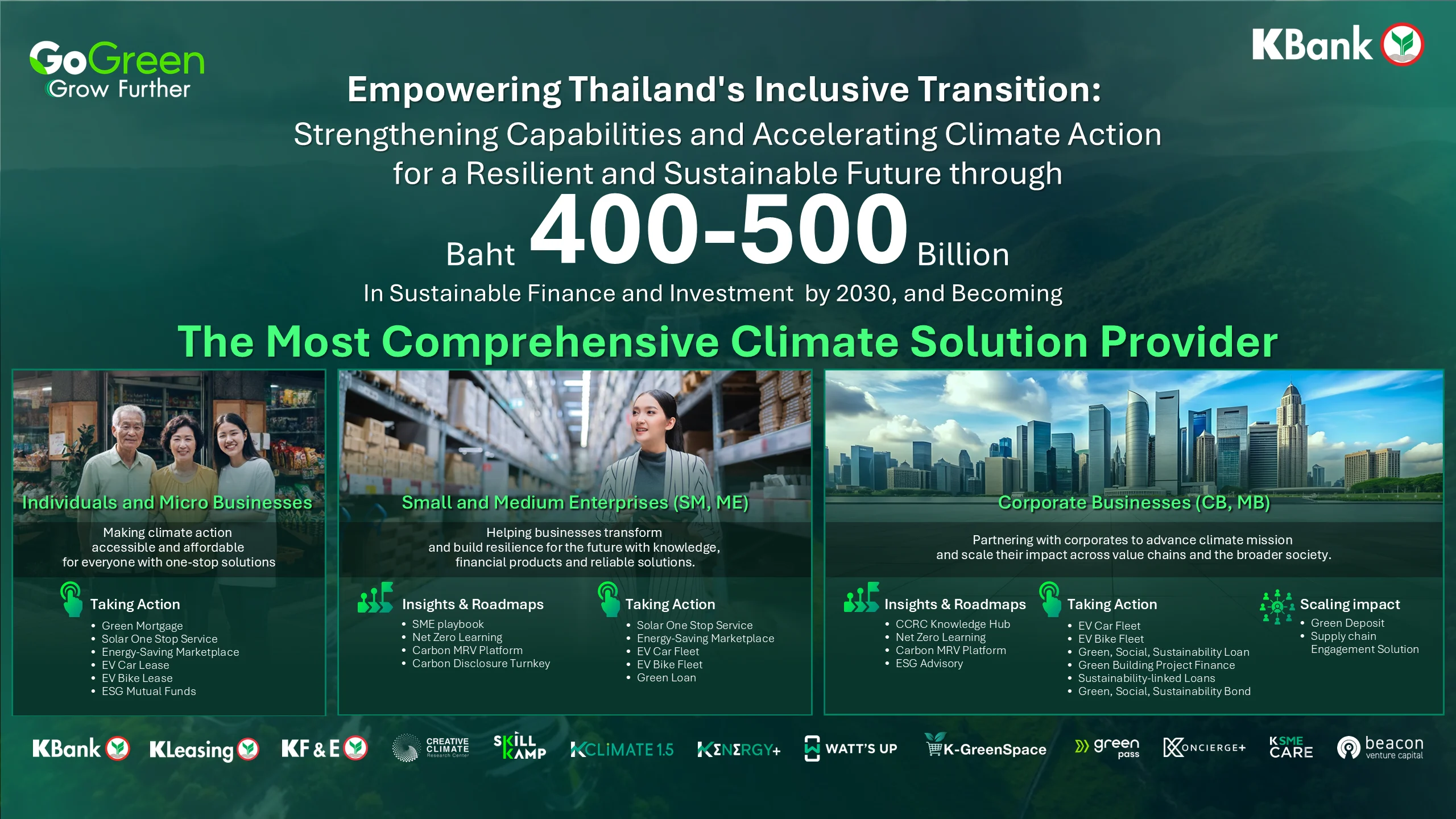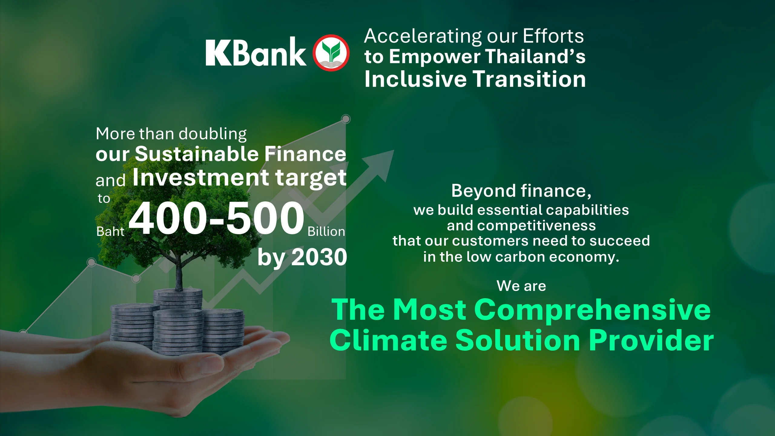 นอกจากนี้ KBank ยังตั้งเป้าเพิ่มวงเงินสินเชื่อและการลงทุนด้านความยั่งยืนจาก 1-2 แสนล้านบาท สู่ 4–5 แสนล้านบาทภายในปี 2030 เพื่อเร่งการเปลี่ยนผ่านสู่เศรษฐกิจคาร์บอนต่ำและสร้างผลกระทบเชิงบวกให้ผู้มีส่วนได้เสียทุกกลุ่ม