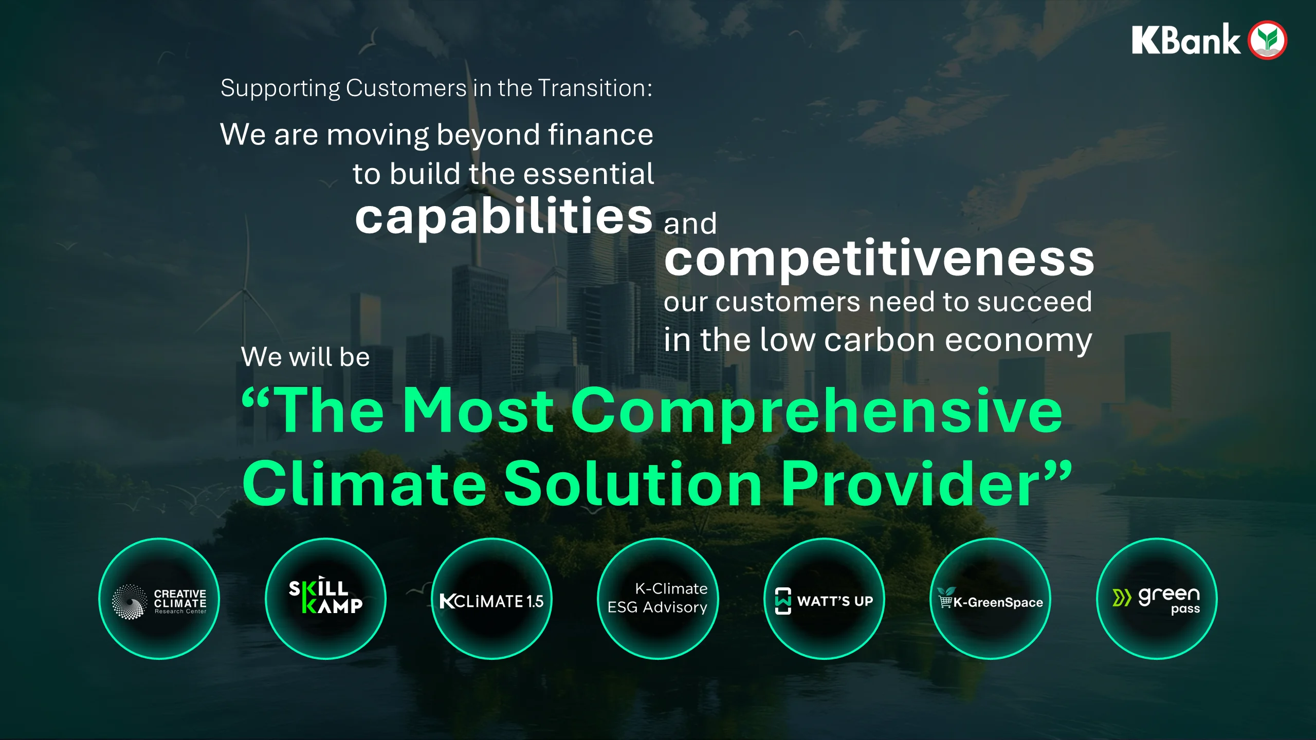 KBank ตั้งเป้า Net Zero และวางตำแหน่งเป็น “The Most Comprehensive Climate Solution Provider” ผู้ให้บริการโซลูชันด้านสภาพภูมิอากาศแบบครบวงจร เพื่อช่วยธุรกิจและสังคมก้าวสู่เศรษฐกิจคาร์บอนต่ำ