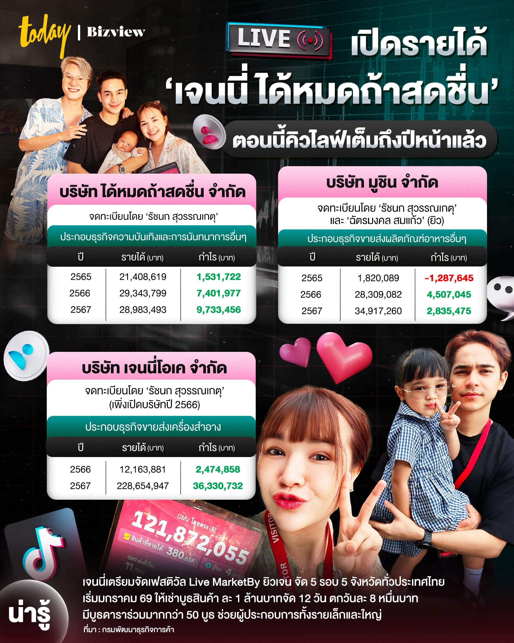 รายได้ของเจนนี่ไม่ได้มาจากไลฟ์ขายของเพียงอย่างเดียว โดยเธอยังมีธุรกิจอื่นๆ และบริษัทในเครือ ทั้ง “ได้หมดถ้าสดชื่น จำกัด” ที่ทำรายได้ปี 2567 กว่า 28.9 ล้านบาท “มูชิน จำกัด” ที่รายได้ทะลุ 34.9 ล้านบาท และ “เจนนี่โอเค จำกัด” ธุรกิจเครื่องสำอางที่เพิ่งเปิดปี 2566 แต่โตพุ่งถึง 228 ล้านบาท กำไร 36 ล้านบาทในปีเดียว