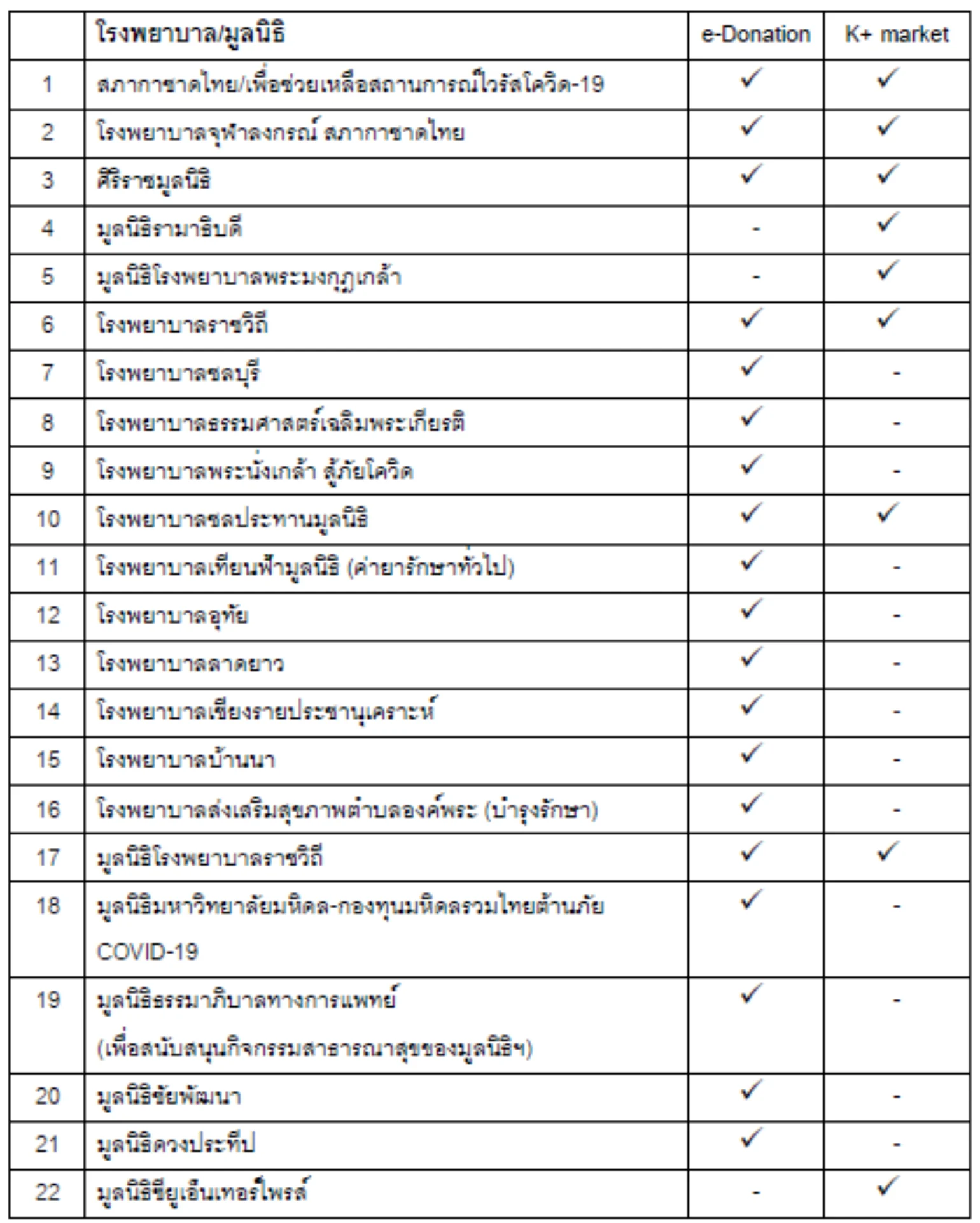- ช่องทาง K+ market บริจาคด้วยเงินในบัญชี K PLUS หรือใช้คะแนน K Point ผ่านแพลตฟอร์ม K+ market บน K PLUS