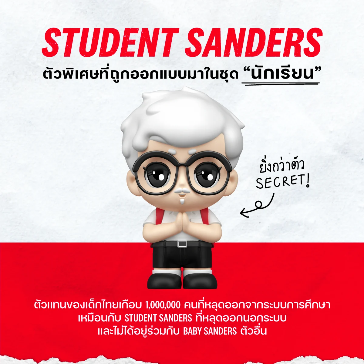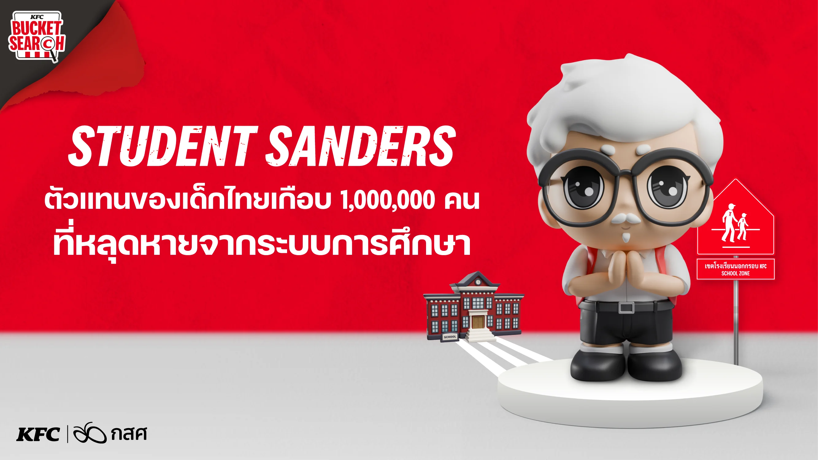 มูลนิธิเคเอฟซี ประเทศไทย สร้างปรากฏการณ์ครั้งใหม่ ด้วยการเปิดตัว “Student Sanders” ฟิกเกอร์สุดพิเศษที่เป็นตัวแทนของเยาวชนไทยเกือบ 1 ล้านคนที่ต้องหลุดออกจากระบบการศึกษา ทำให้การซื้อของสะสมกลายเป็นการระดมทุนเพื่อมาส่งเสริมศักยภาพของเด็กไทยเหล่านี้ ให้ได้กลับเข้าสู่สังคมและกลับไปทำตามความฝันอีกครั้ง