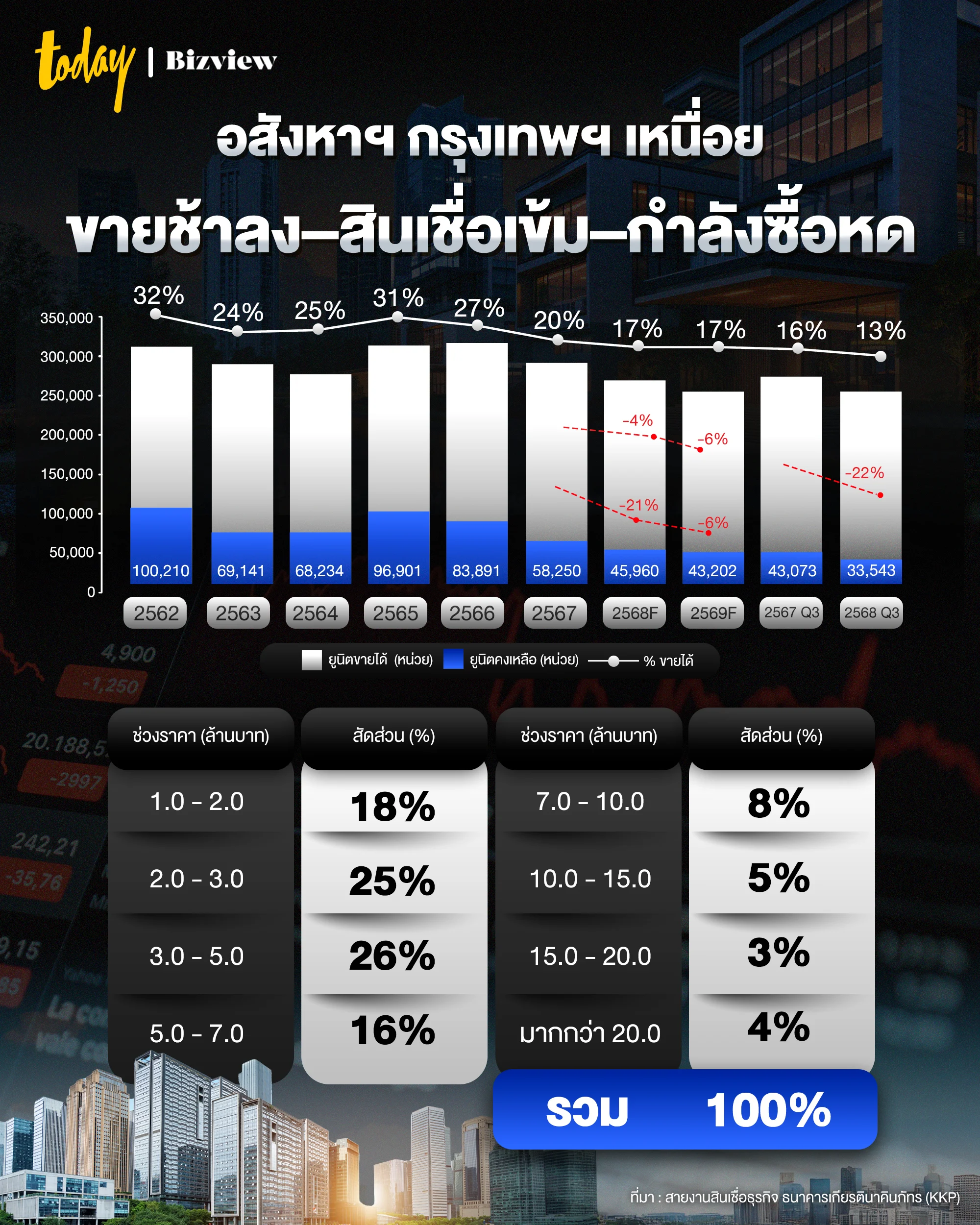 สะท้อนชัดว่าผู้ซื้อส่วนใหญ่อยู่ในกลุ่มรายได้ประมาณ 20,000–100,000 บาทต่อครัวเรือนต่อเดือน ในทางตรงกันข้าม บ้านราคาตั้งแต่ 20 ล้านบาทขึ้นไป มีเพียง 4% ของยูนิตขายได้ทั้งหมด แม้กลุ่มนี้จะไม่ค่อยได้รับผลกระทบด้านรายได้ในอดีต แต่ในปี 2568 เริ่มเห็นสัญญาณความเปราะบางมากขึ้น ซึ่งอาจส่งผลต่อสต๊อกบ้านลักชัวรีในอนาคต