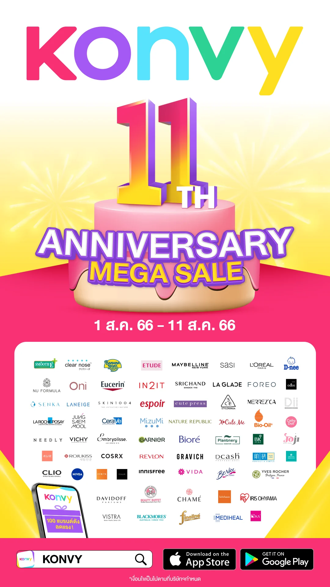 สำหรับแคมเปญ ‘Konvy 11th Anniversary Mega Sale 2023’ “คอนวี่” (Konvy) ได้รวบรวมแบรนด์ชั้นนำถึง 100 แบรนด์ อาทิ Eucerin, Biore, L’OREAL, BeNice, Plantnery และอีกมากมาย ที่ร่วมจัดโปรโมชั่นลดแรงแบบห้ามพลาด ไม่ว่าจะเป็น