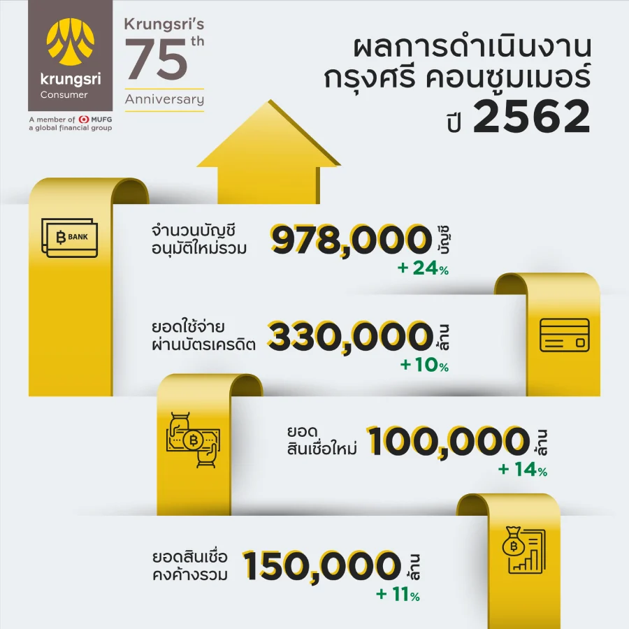 สำหรับผลประกอบการปี 2562 กรุงศรี คอนซูมเมอร์ ยังคงเติบโตอย่างแข็งแกร่ง โดยมียอดใช้จ่ายผ่านบัตรเครดิต 330,000 ล้านบาท (เติบโต 10%), ยอดสินเชื่อใหม่ 100,000 ล้านบาท (เติบโต 14%), จำนวนบัญชีอนุมัติใหม่รวม 978,000 บัญชี (เติบโต 24%) และยอดสินเชื่อคงค้างรวม 150,000 ล้านบาท (เติบโต 11%)