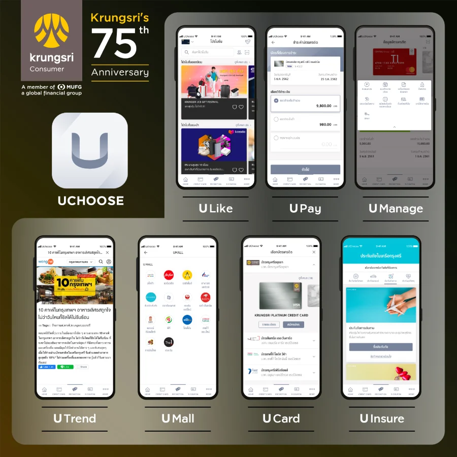 และสำหรับ ‘The New UCHOOSE’ แอปพลิเคชั่นยูชูสเวอร์ชั่นใหม่สำหรับสมาชิกบัตรเครดิตในเครือกรุงศรี คอนซูมเมอร์ ที่ช่วยให้การบริหารการใช้จ่ายง่ายยิ่งขึ้น ลูกค้าจะได้พบตั้งแต่วันที่ 3 มีนาคมนี้เป็นต้นไป ซึ่งมีทั้ง U Manage บริการบริหารบัญชีบัตรเครดิตง่ายๆ ด้วยตนเอง, U Pay บริการชำระค่าบัตรเครดิตผ่านโมบายล์ แบงก์กิ้ง, U Card บริการสมัครบัตรเครดิตในเครือกรุงศรี คอนซูมเมอร์แบบออนไลน์ และบริการอื่นๆ อีกมากมายที่พร้อมตอบโจทย์ทุกไลฟ์สไตล์ของสมาชิกบัตร ภายใต้แนวคิด “ชีวิตที่คุณเลือกได้” (Choose the Life You Live) เช่น คัดสรรโปรโมชั่นตรงใจพิเศษเฉพาะคุณ, สนุกกับการช้อปดีลสุดคุ้มจากพันธมิตรหลากหลายผ่านแอป, เลือกแบบประกันภัยที่มอบความคุ้มครองที่ตอบโจทย์, พร้อมติดตามเทรนด์ร้านอาหาร ที่เที่ยว ที่ช้อปใหม่ๆ และเกร็ดความรู้ที่น่าสนใจด้านการบริหารเงิน โดยทางกรุงศรี คอนซูมเมอร์ ตั้งเป้าเพิ่มยอดดาวน์โหลดและลงทะเบียนบัตรครบ 6 ล้าน ภายในสิ้นปี 2563 นี้