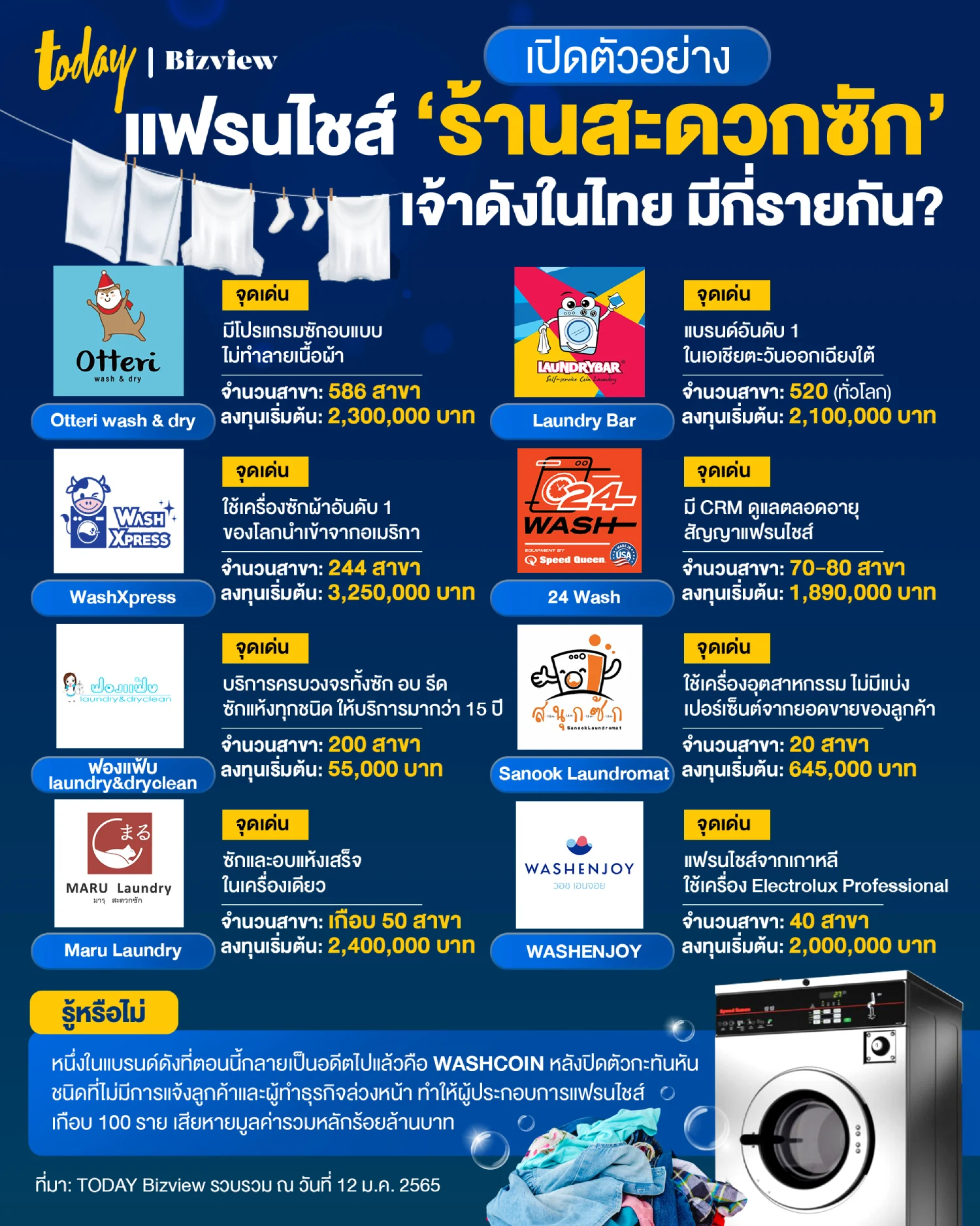 หนึ่งในธุรกิจที่ฮิตหนักมากและเติบโตแบบก้าวกระโดดในช่วง 3-4 ปีที่ผ่านมา คงหนีไม่พ้นธุรกิจ ‘แฟรนไชส์ร้านสะดวกซัก’ ที่ได้รับการตอบรับที่ดีจากผู้บริโภคชาวไทย