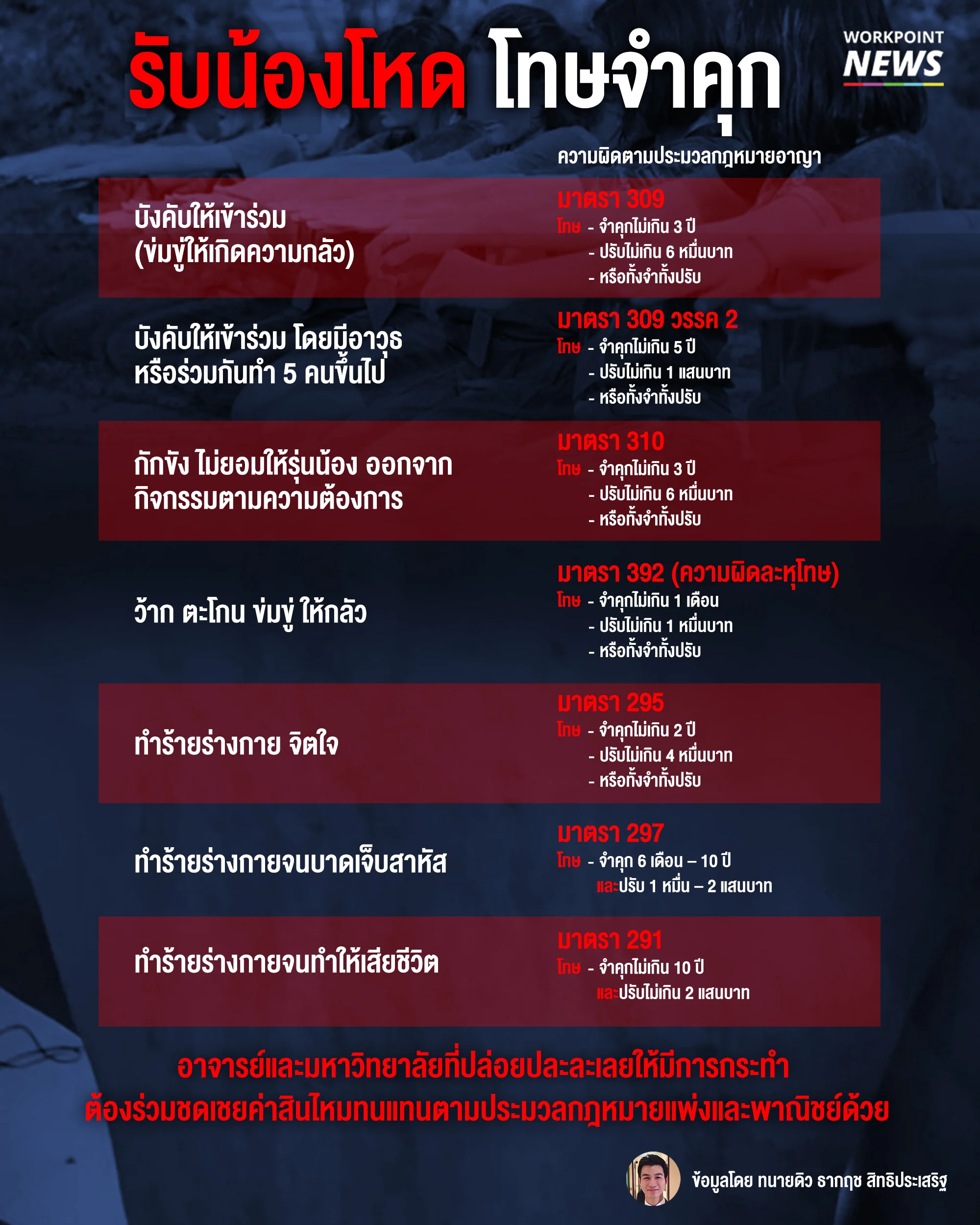 สำหรับเหตุการณ์รับน้องที่ใช้ความรุนแรงแบบนี้เกิดขึ้นบ่อยครั้ง นายธากฤช สิทธิประเสริฐ หรือ ทนายดิว ถึงความผิดทางอาญาและบทลงโทษ โดยแบ่งลักษณะการกระทำผิดและบทลงโทษดังนี้