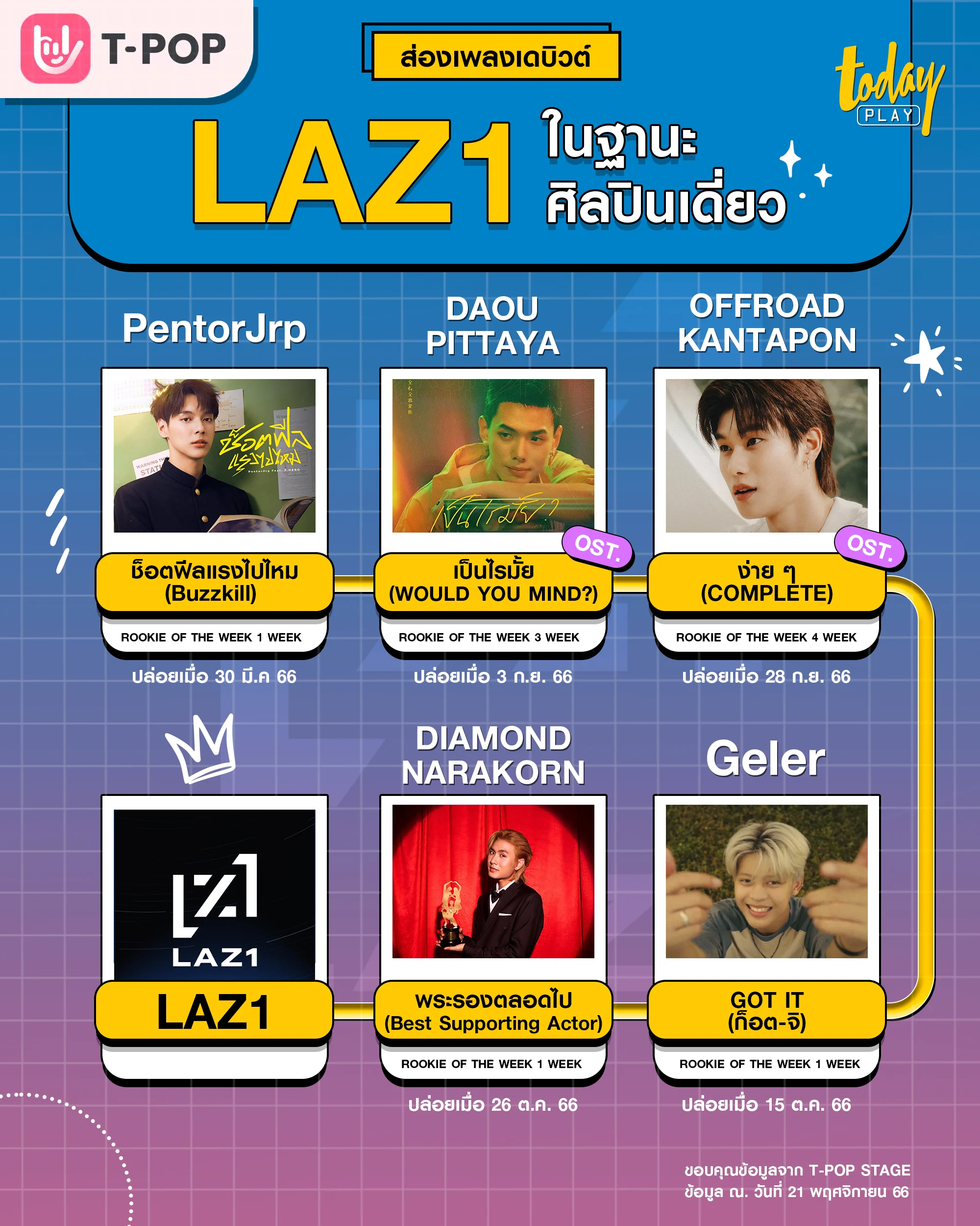 ถึงแม้ LAZ1 จะหมดสัญญาไปเมื่อต้นปีที่ผ่านมา แต่ก็มีหลับมารวมตัวกันอยู่เรื่อย ๆ และแต่ละคนก็ยังได้มีผลงานออกมาให้แฟน ๆ ได้หายคิดถึงอยู่เสมอ กับผลงานเพลงในฐานะศิลปินเดี่ยวที่สะท้อนตัวตนของเเต่ละคนไว้อย่างชัดเจน วันนี้ TODAY Play จะพาทุกคน ไปดูซิงเกิลเดบิวต์ของ 5 หนุ่ม LAZ1 ในบทบาทศิลปินเดี่ยว ที่ได้สร้างตำนานบทใหม่ของ LAZ1 กับการคว้าถ้วยรางวัล ROOKIE OF THE WEEK จากรายการ T-POP STAGE SHOW ครบทั้ง 5 คน