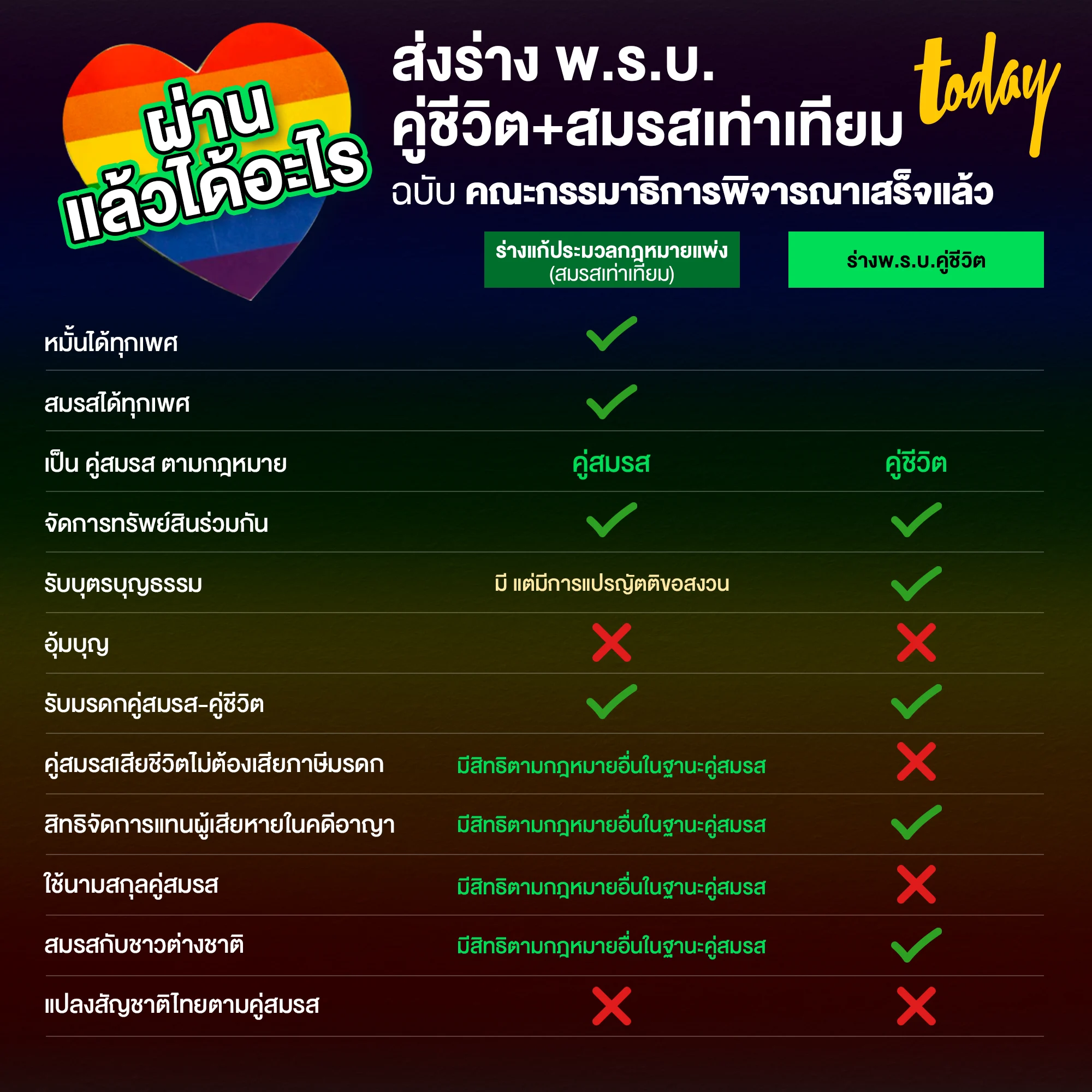 อย่างไรก็ดียังคงต้องลุ้นว่า ร่าง พ.ร.บ.ฉบับใดฉบับหนึ่งจะมีมติให้คว่ำร่างหรือไม่ หากร่างพ.ร.บ.แก้ไขเพิ่มเติมประมวลกฎหมายแพ่งและพาณิชย์ หรือ พ.ร.บ. สมรสเท่าเทียมได้รับเสียงสนับสนุนจากสภาฯ เกินครึ่งผู้จดทะเบียนสมรสภายใต้ พ.ร.บ.ฉบับนี้จะมีสถานะเฉกเช่น “คู่สมรส” แต่หากร่าง พ.ร.บ.แก้ไขเพิ่มเติมประมวลกฎหมายแพ่งและพาณิชย์ถูกคว่ำและมีเพียงร่าง พ.ร.บ.คู่ชีวิต ผ่านเข้าไปในวาระ 3 สถานะของผู้จดทะเบียนจะเป็นเพียง “คู่ชีวิต” ซึ่งได้สิทธิไม่มากเมื่อเทียบกับการเป็นคู่สมรสตามที่แจกแจงมาในตาราง