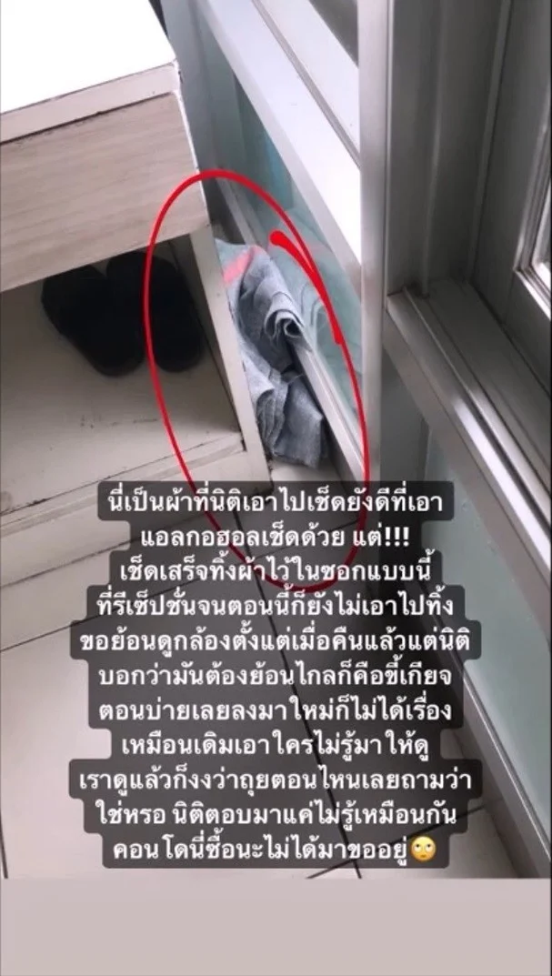 วันที่ 1 มี.ค. ผู้สื่อข่าวเดินทางไปพูดคุยกับ เจ้าของเฟสบุ๊กดังกล่าวถึงเ รื่องที่เกิดขึ้น โดย น.ส.ส้ม (นามสมมุติ) อายุ 21 ปี เล่าว่าวันที่ 28 ก.พ. หลังจากที่ตนกลับจากทำธุระม าที่คอนโดย่านจอมเทียนและเด ินเข้าลิฟท์เพื่อที่จะขึ้นไ ปยังห้องพัก ได้พบกับกับคราบน้ำลายชึ่งไ ม่รู้ว่าของใครและมีเชื้อโร คหรือไม่