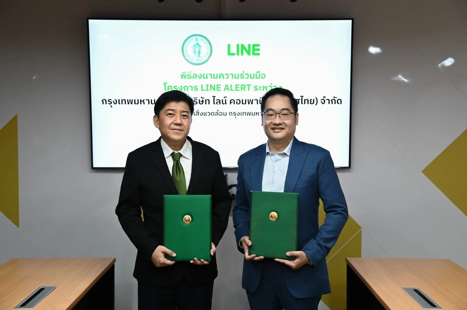 นายประพาส เหลืองศิรินภา ผู้อำนวยการสำนักสิ่งแวดล้อม และพิชญ์ หมื่นรักษ์ หัวหน้าฝ่ายรัฐกิจสัมพันธ์ บริษัท ไลน์ คอมพานี (ประเทศไทย) จำกัด ร่วมลงนามในบันทึกความร่วมมือ (MOU) โครงการ LINE ALERT ระหว่างกรุงเทพมหานคร และบริษัท ไลน์ คอมพานี (ประเทศไทย) จำกัด