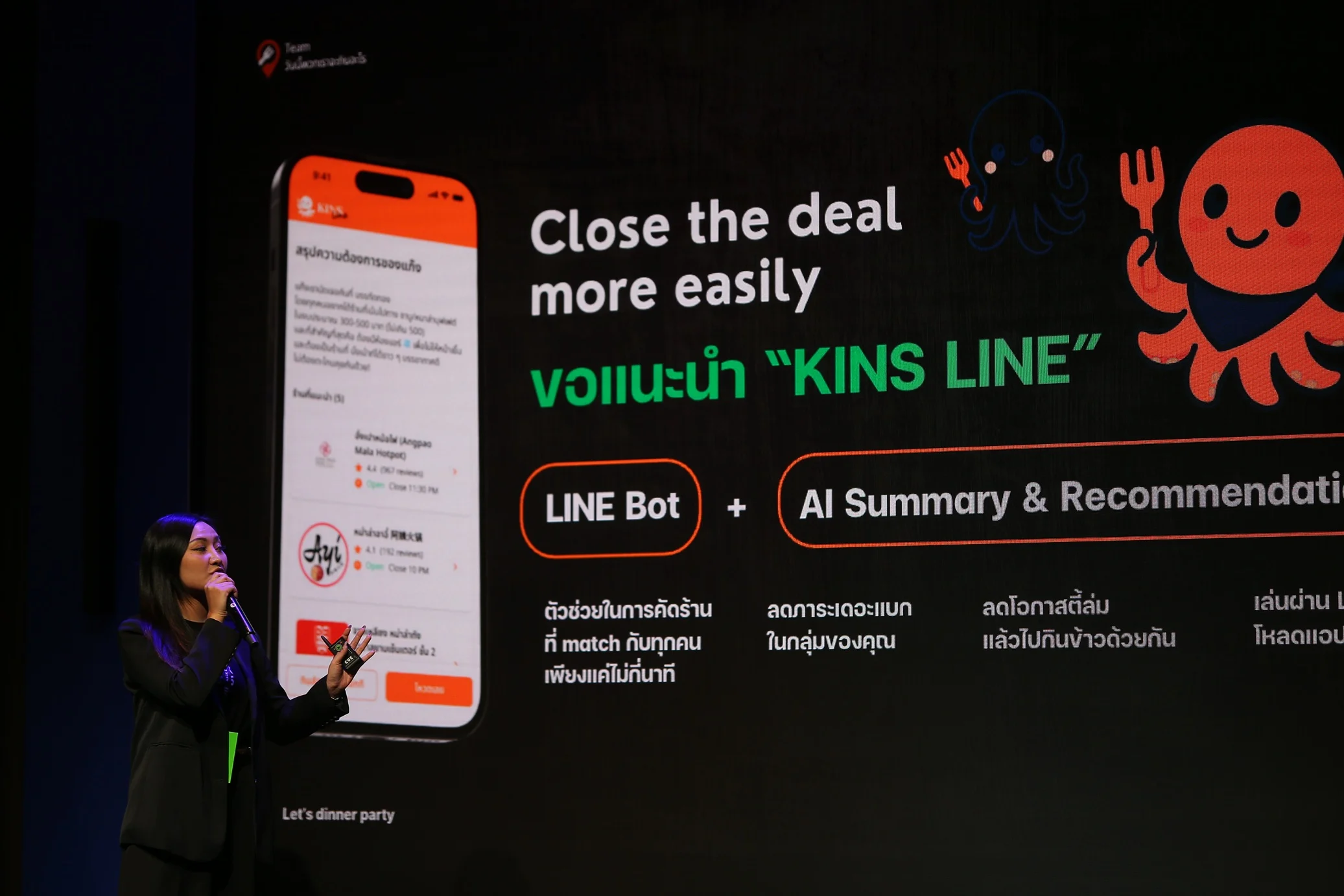 รางวัลชนะเลิศ ได้แก่ทีม “วันนี้พวกเราจะกินอะไร” จากผลงาน ‘KINS LINE’ โซลูชันช่วยแก้ปัญหาอมตะของทุกกลุ่มเพื่อนอย่าง “วันนี้จะกินอะไร?” ด้วย LINE MINI App ที่พร้อมให้สมาชิกใส่ความต้องการของแต่ละคนได้ จากนั้น ใช้ AI ช่วยสรุปความคิดเห็น และวิเคราะห์นำเสนอลิสต์ร้านที่ตรงใจด้วยข้อมูลร้านผ่าน Google API แจ้งเตือนกลับในกลุ่มแชต LINE ให้สมาชิกโหวตภายในเวลาที่กำหนดไว้พร้อมสรุปผลให้ครบจบดีลโดยอัตโนมัติทุกขั้นตอนเป็นไปอย่างรวดเร็วและโปร่งใสสมาชิกสามารถรีวิวร้านก่อนตัดสินใจทำให้หาข้อสรุปร่วมกันได้ภายในไม่กี่นาที