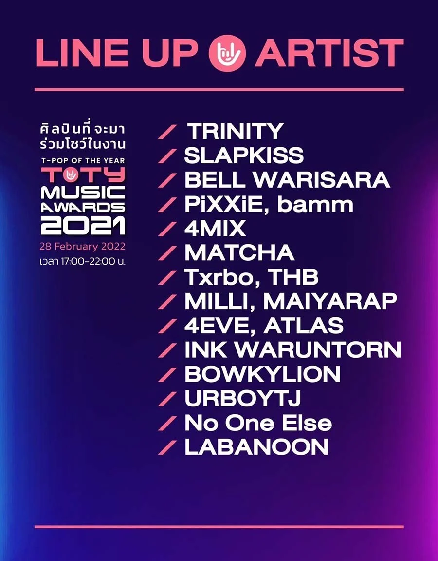 ล่าสุด (24 ก.พ. 2565) ได้ประกาศไลน์อัปศิลปินที่จะร่วมโชว์ในงาน TOTY MUSIC AWARDS 2021 ซึ่งมีทั้ง TRINITY, SLAPKISS, BELL WARISARA, PiXXiE, bamm, 4MIX, MATCHA, Txrbo, THB, MILLI, MAIYARAP, 4EVE, ATLAS, INK WARUNTORN, BOWKYLION, URBOYTJ, No One Else และ LABANOON