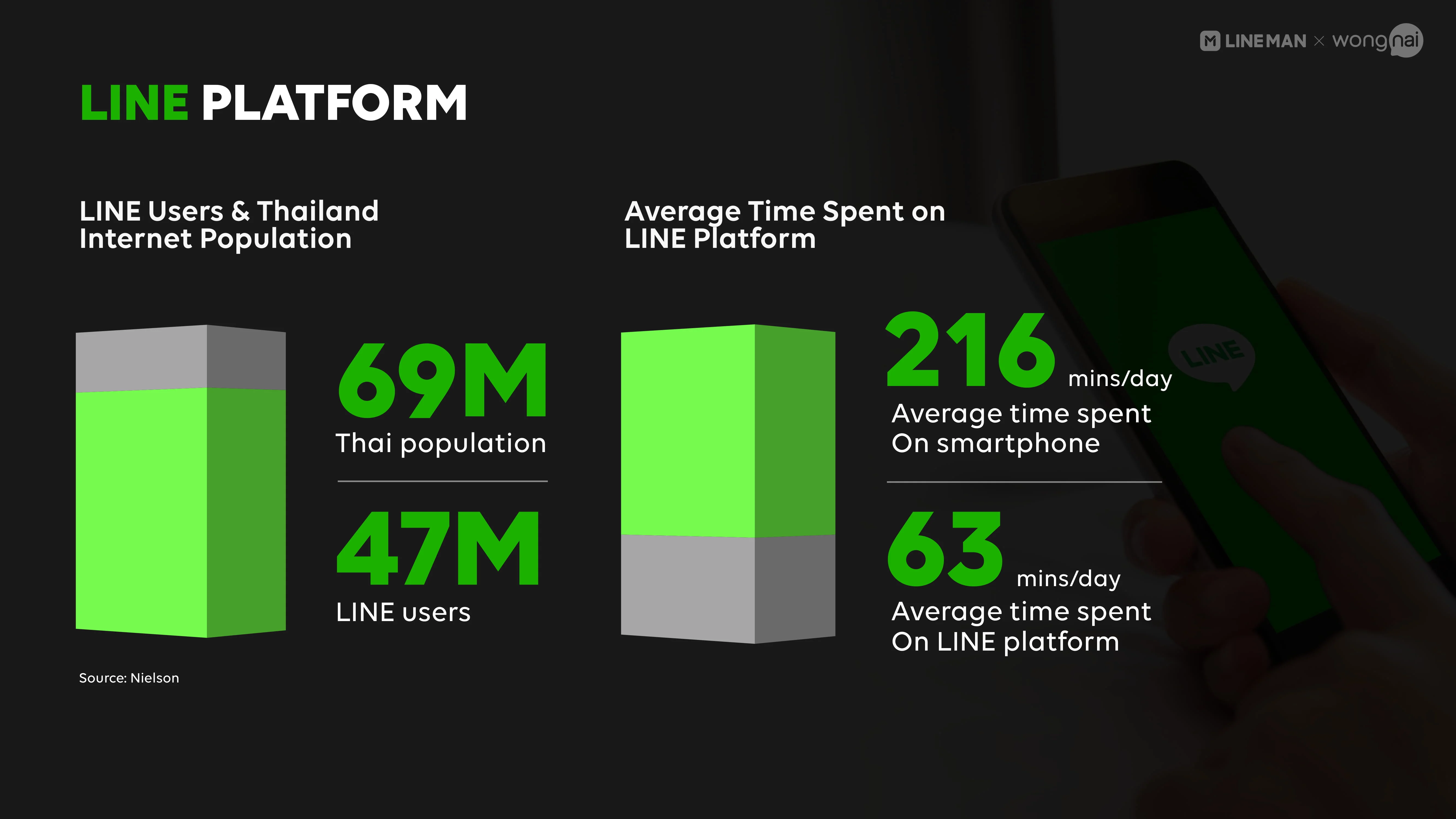 ปัจจุบันประเทศไทยมีผู้ใช้แอปฯ LINE 47 ล้านบัญชี และมีการใช้งานแพลตฟอร์มของ LINE โดยเฉลี่ยอยู่ที่ 63 นาทีต่อวัน จาก 216 นาทีที่ใช้งานสมาร์ทโฟน
