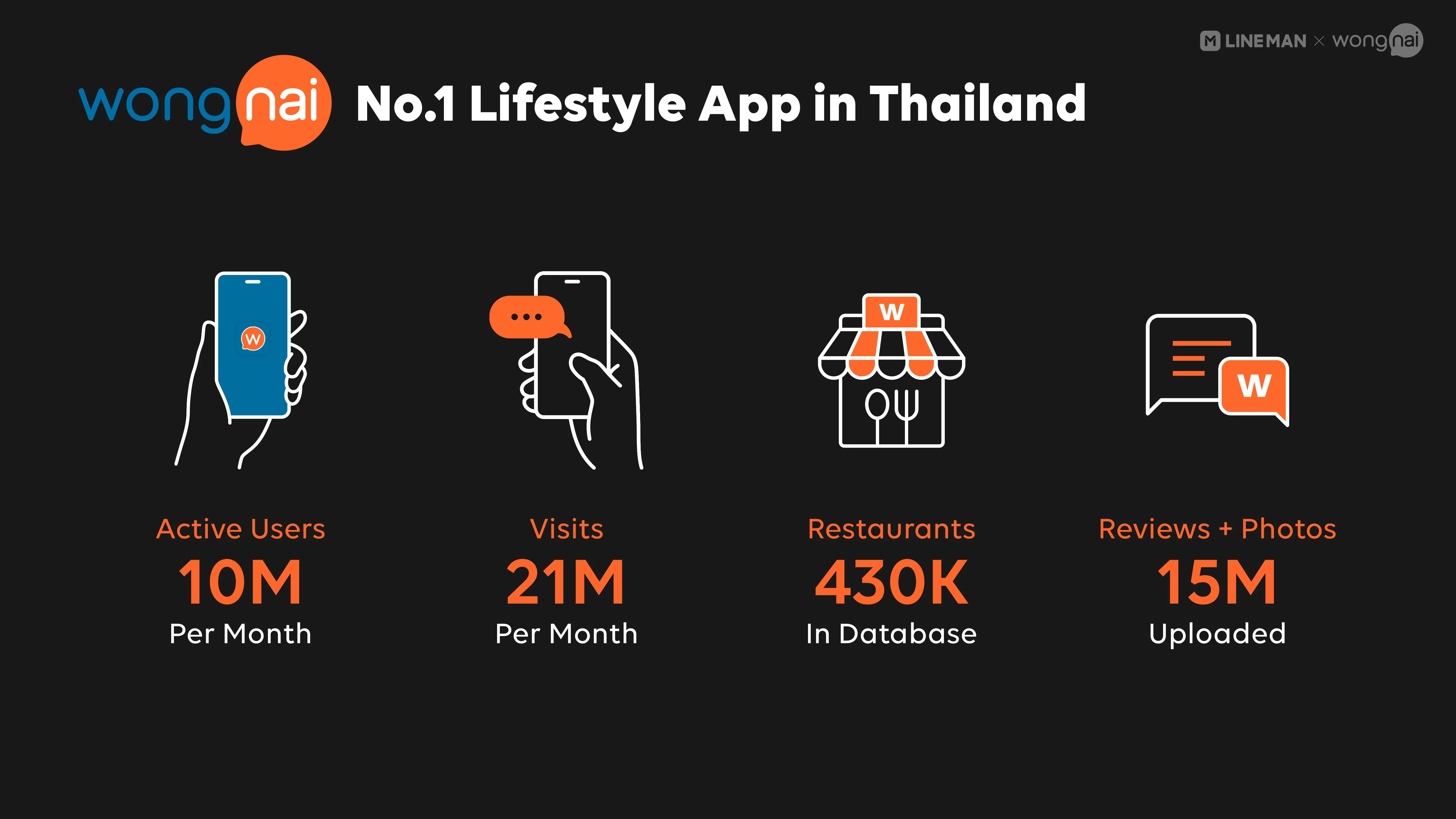 Wongnai มีตัวเลขผู้ใช้งานต่อเดือน 10 ล้านบัญชี และมีฐานข้อมูลร้านอาหาร 430,000 ร้าน