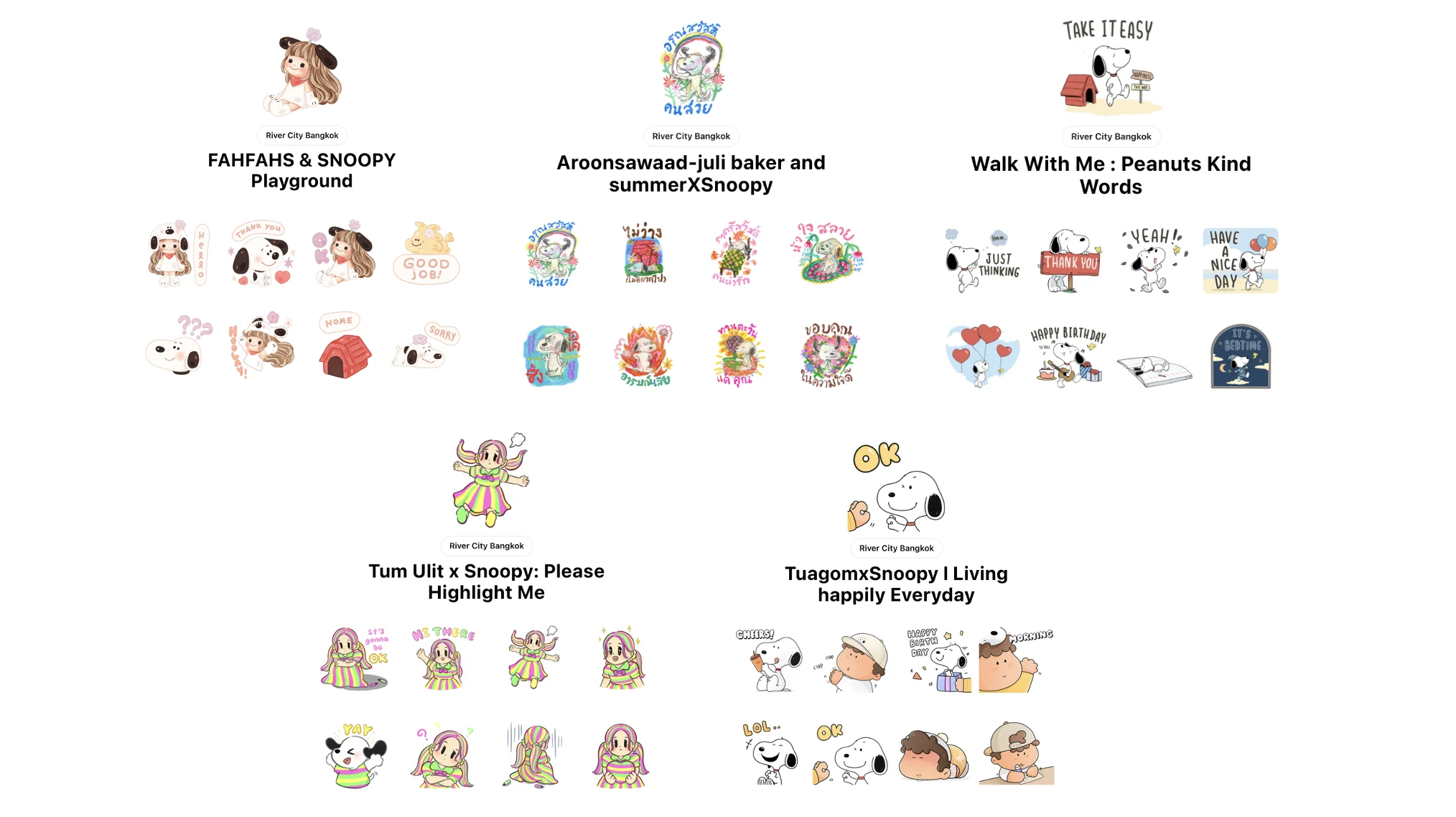 คอลเลกชัน LINE STICKERS พิเศษในโปรเจกต์ “How Do You Do, Snoopy? 75 Years: A Journey of Friendship Through Art” เป็นการนำเสนอคาแรกเตอร์ Snoopy ในมุมมองใหม่ผ่านลายเส้นอันเป็นเอกลักษณ์ของ 5 ศิลปินไทยชื่อดัง ได้แก่ FAHFAHS เจ้าของคาแรกเตอร์เด็กผู้หญิงตาโตในโทนสีพาสเทลอ่อนโยนสุดอบอุ่น, Tum Ulit ศิลปินผู้ถ่ายทอดสไตล์ผลงานที่น่ารัก เรียบง่าย ในรูปแบบสีหม่น ๆ สื่อถึงความเหงาและความเปราะบาง, Juli Baker and Summer กับงานเพนต์ลายเส้นอิสระที่โดดเด่นด้านการใช้สีสันสดใสเต็มไปด้วยพลังบวก, Tuagomstudio เจ้าของคาแรกเตอร์ “ตัวกลม” ที่ดูเป็นมิตรกับทุกคน และ Munins ผู้ถ่ายทอดความนุ่มละมุนในสไตล์มินิมัลที่ลึกซึ้งกินใจ