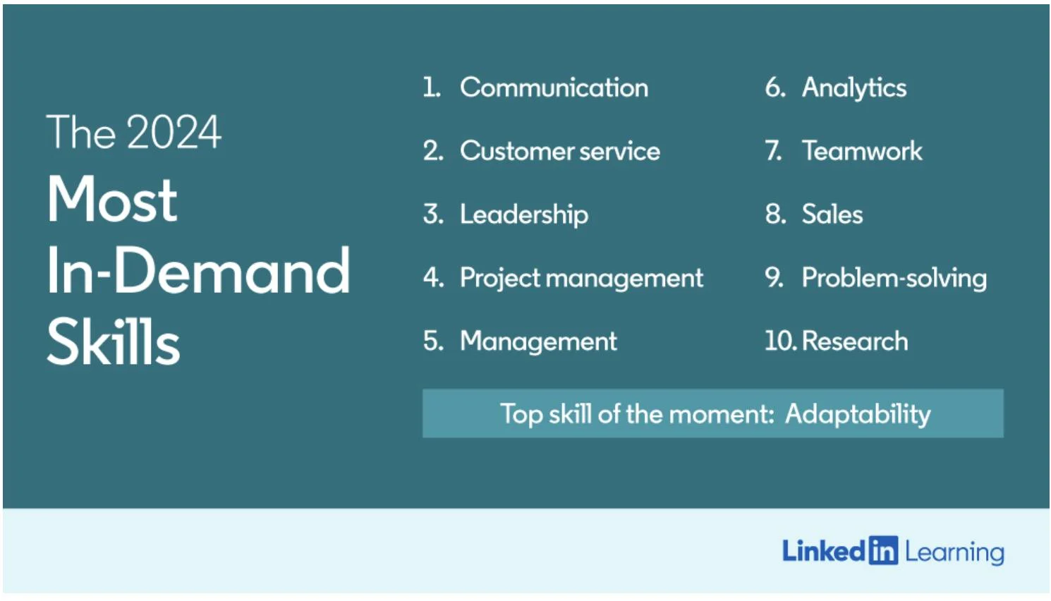 LinkedIn ได้ทำการวิจัยรายการทักษะที่เป็นที่ต้องการมากที่สุดประจำปี 2024 โดยสรุปทักษะที่ร้อนแรงที่สุดตามตลาดงาน สำรวจจากสมาชิก LinkedIn ที่ได้รับการจ้างงานล่าสุด พบว่า ‘ทักษะสื่อสาร’ อยู่ในอันดับที่หนึ่ง