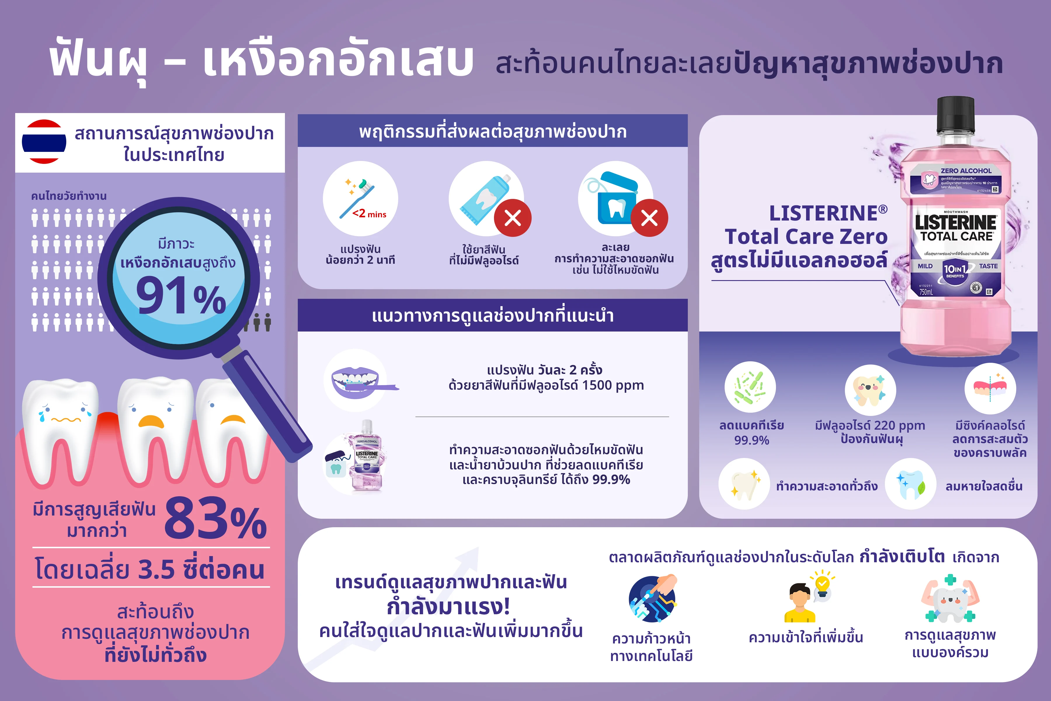 นอกเหนือจากการสร้างความตระหนักและให้ความรู้ด้านสุขภาพในช่องปาก พร้อมส่งเสริมให้ทุกคนปรับพฤติกรรมการดูแลช่องปากอย่างถูกวิธีแล้ว ในปีนี้ ลิสเตอรีน® ยังได้เปิดตัว น้ำยาบ้วนปาก LISTERINE Total Care Zero นวัตกรรมผลิตภัณฑ์ดูแลช่องปาก สูตรที่ดีที่สุดของลิสเตอรีน ซึ่งผ่านการทดสอบแล้วว่า ช่วยดูแลช่องปากและฟัน เพื่อสุขภาพเหงือกและฟันดีได้ถึง 10 ประการในขวดเดียว ซึ่งรวมถึงการลดแบคทีเรียที่เป็นสาเหตุของกลิ่นปาก การสะสมของคราบจุลินทรีย์ในช่องปาก ช่วยให้เหงือกดูสุขภาพดี ป้องกันฟันผุ และช่วยส่งเสริมสุขภาพฟันให้แข็งแรง ซึ่งได้รับการพิสูจน์ทางคลินิกแล้วว่ามีประสิทธิภาพ ลดแบคทีเรียได้ถึง 99.9%**
