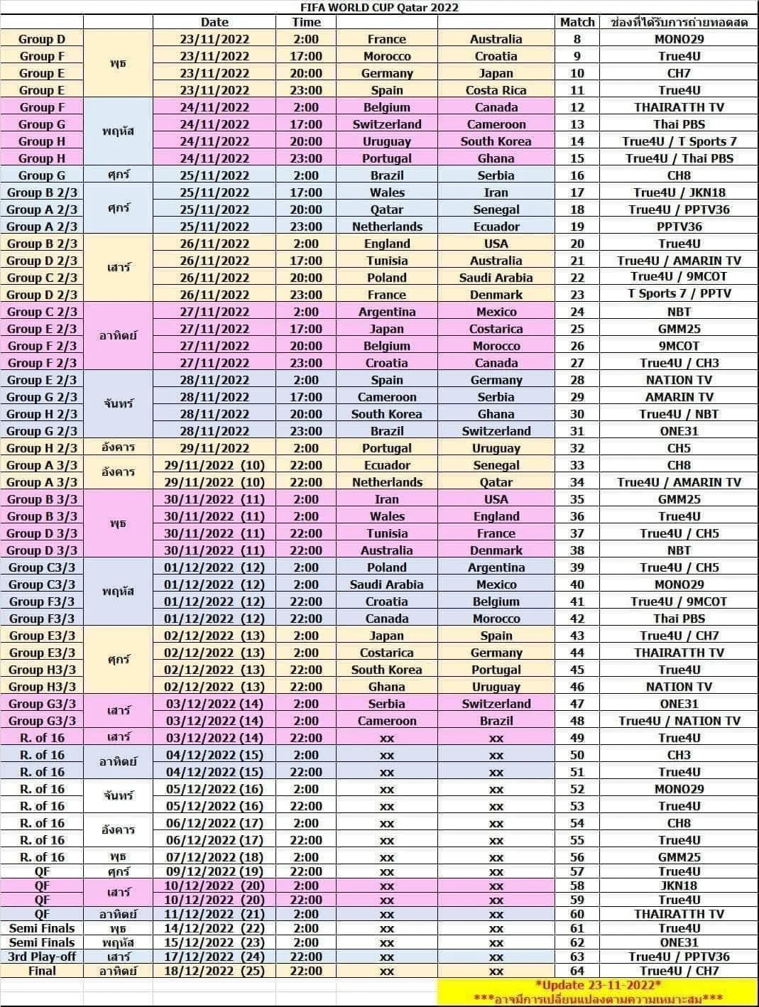 ตารางถ่ายทอดสดใหม่ปรับเปลี่ยนตามที่จับสลาก (23 พ.ย. 65)