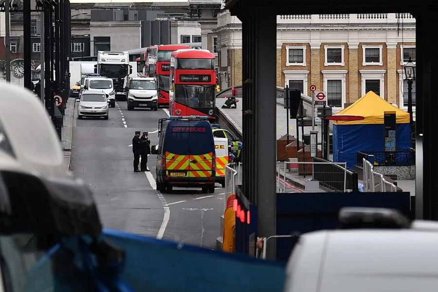 ตำรวจยังคงทำงานต่อที่ London Bridge ในกรุงลอนดอนในวันที่ 1 ธันวาคม 2019 หลังจากเหตุการณ์ก่อการร้ายที่ร้ายแรงถึงวันที่ 29 พฤศจิกายน บอริสจอห์นสัน ของสหราชอาณาจักร กล่าวว่า การรักษาความปลอดภัยกำลังเดินหน้า ตรวจสอบผู้ก่อการร้ายที่ถูกปล่อยตัวก่อนกำหนดจากเรือนจำเนื่องจากการโจมตีที่สะพานลอนดอนเริ่มขึ้นในการหาเสียงเลือกตั้ง (ภาพโดย: Ben STANSALL / AFP)