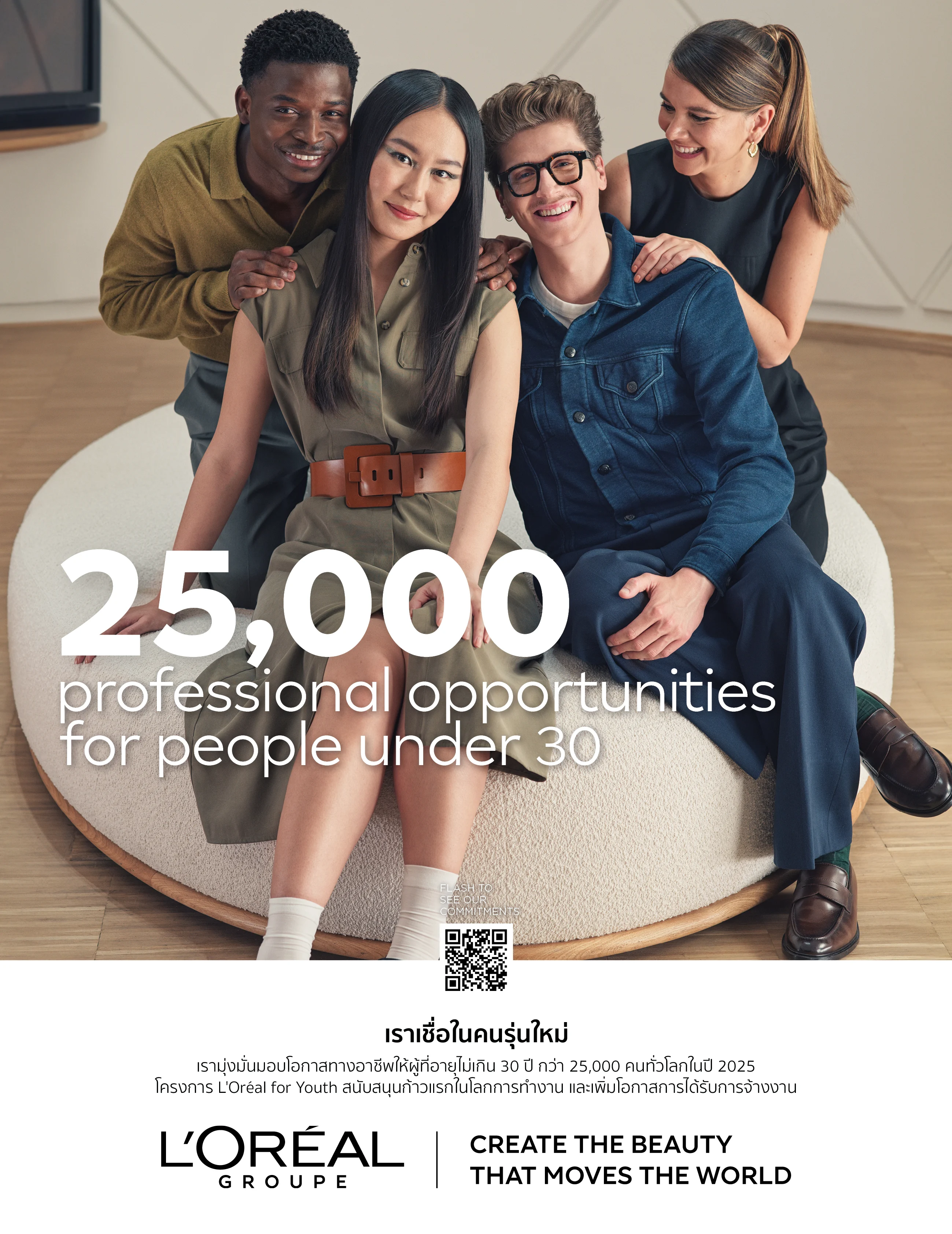 ปี 2025 ลอรีอัลเปิดโอกาสให้คนอายุไม่เกิน 30 ปี กว่า 25,000 คนทั่วโลก เข้าร่วมโครงการ L’Oréal For Youth หรือ L4Y จุดเริ่มต้นนี้ไม่ได้เป็นแค่งานแรก แต่เป็นโอกาสให้ลองทำจริง เรียนรู้สิ่งที่ไม่ได้มีสอนในห้องเรียน และเข้าใจโลกการทำงานจริง ๆ ทำให้พวกเขาได้ลองค้นหาว่าอะไรเหมาะกับตัวเอง และสร้างโอกาสให้ได้เริ่มต้นเส้นทางอาชีพอย่างมั่นใจ อีกทั้งยังเพิ่มโอกาสการได้รับการจ้างงานให้คนรุ่นใหม่