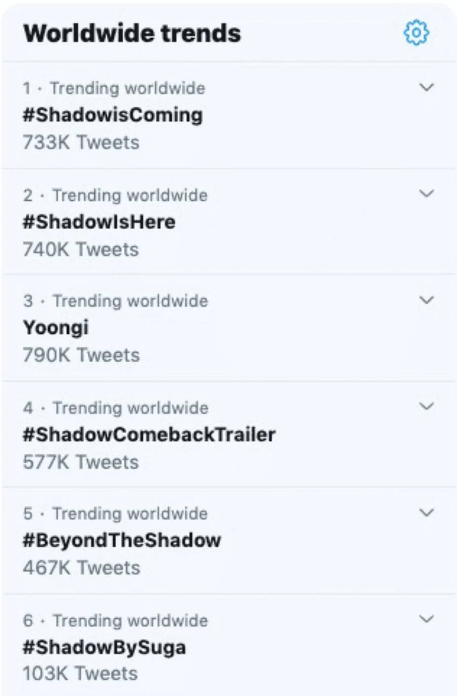 ในวันที่ 10 ม.ค. 2563 BTS ได้ประเดิมปล่อยทีเซอร์แรกจากอัลบั้ม ส่งผลให้แฮชแท็ก #ShadowIsComing ติดอันดับ 1 บนเทรนด์ทวิตเตอร์ของโลก