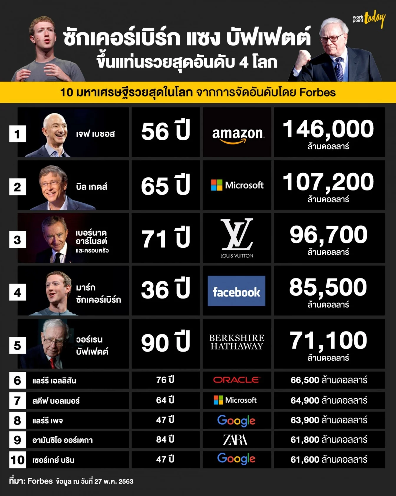 มาร์ก ซักเคอร์เบิร์ก ผู้ก่อตั้งและ CEO ของเฟซบุ๊ก แซงหน้าวอร์เรน บัฟเฟตต์ ขึ้นเป็นมหาเศรษฐีอันดับ 4 ของโลกแล้ว ตามการจัดอันดับของ Forbes โดยสาเหตุหลักๆ มาจาการที่ปีนี้หุ้นของเฟซบุ๊กราคาเพิ่มขึ้นกว่า 14% ในขณะที่หุ้นเบิร์กเชียร์แฮทาเวย์ของบัฟเฟตต์ มูลค่าลดลง 23% จากวิกฤติโควิด-19 นอกจากนี้ บัฟเฟต์ยังบริจาคเงินให้การกุศลมากกว่าผู้ก่อตั้งเฟซบุ๊กด้วย
