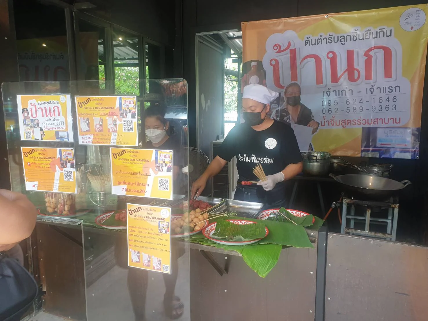 ในที่สุดชาวกรุงเทพฯ ก็มีโอกาสได้กินลูกชิ้นยืนกินแบบไม่ต้องขับรถไปถึงบุรีรัมย์กันแล้ว โดยเมื่อวันเสาร์ที่ 18 ก.ย. 2564 มีร้านลูกชิ้นยืนกิน ที่ได้รับลิขสิทธิ์จากป้านก เปิดเป็นเจ้าแรกในกรุงเทพฯ โดยร้านอยู่ใน X RED DIAMOND ถนนเลียบทางด่วนรามอินทรา ทางลัดไปซอยลาดพร้าว 71 เปิดขายตั้งแต่ 9.00 – 17.00 น. และมีบริการสั่งทาง App Lineman “ร้านป้านก ลูกชิ้นยืนกิน เจ้าแรก เจ้าตำรับ X RED DIAMOND”