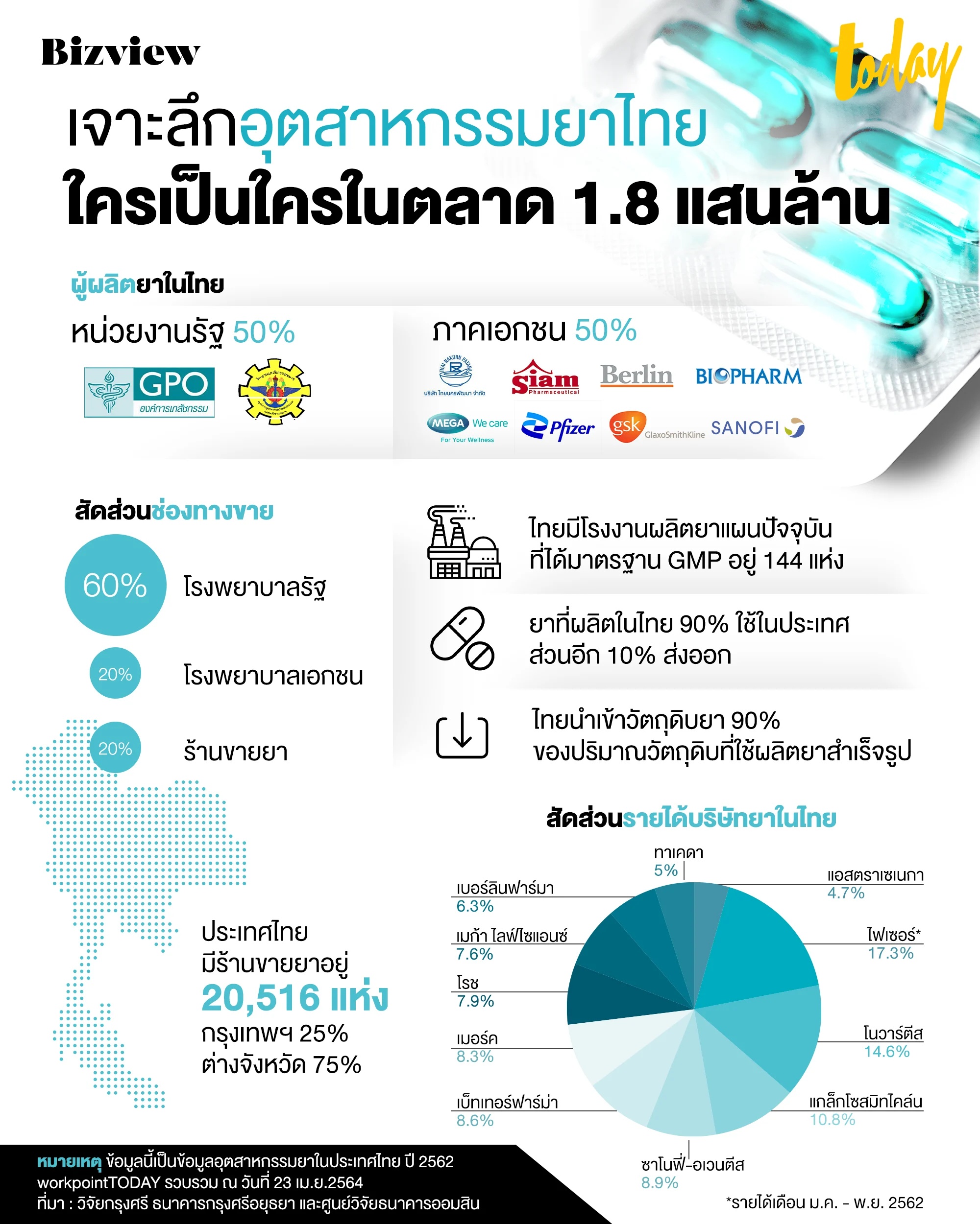 ข้อมูลจากวิจัยกรุงศรี ธนาคารกรุศรีอยุธยา ระบุว่า ในปี 2562 ตลาดยาในประเทศไทยมีมูลค่ารวม 1.84 แสนล้านบาท ขยายตัว 4.2% จากปีก่อนหน้า มีขนาดตลาดใหญ่เป็นอันดับสองในภูมิภาคเอเชียตะวันออกเฉียงใต้ เป็นรองเพียงอินโดนีเซียเท่านั้น