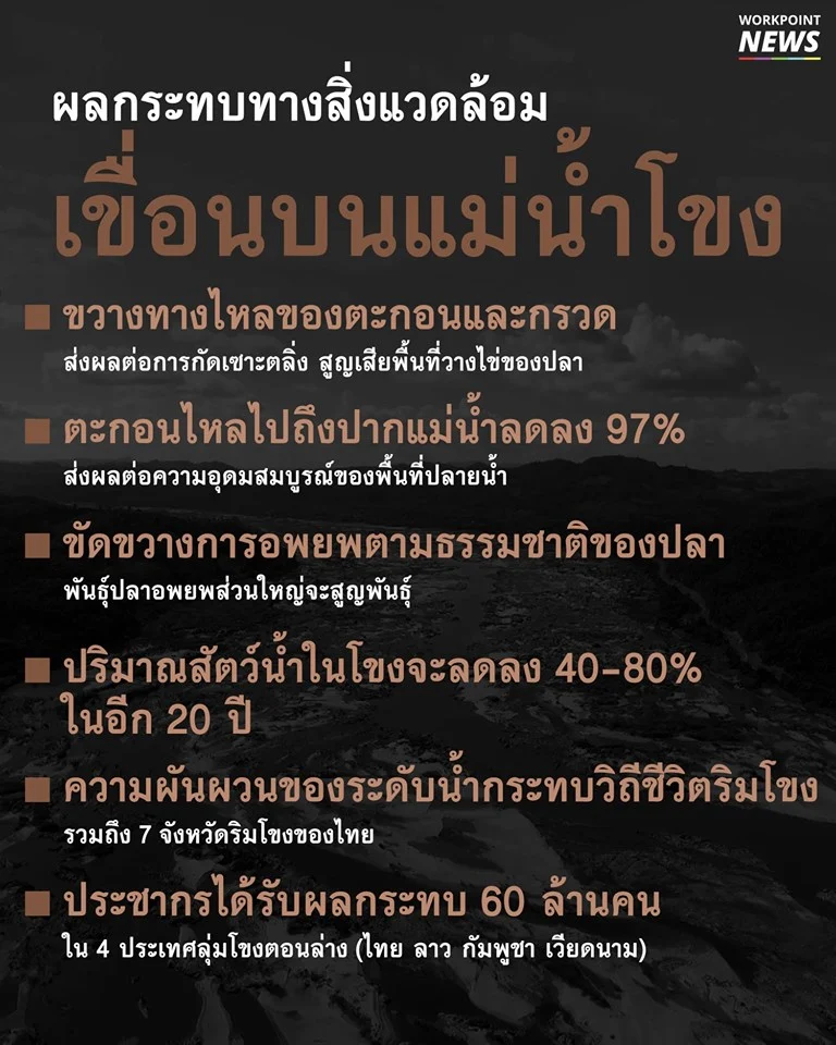เขื่อนบนแม่น้ำโขงกำลังส่งผลกระทบต่อระบบนิเวศของลุ่มน้ำโขงอย่างรุนแรง ทั้งขวางทางไหลของตะกอนและกรวด ซึ่งส่งผลต่อความอุดมสมบูรณ์ของพื้นที่ลุ่มน้ำ ขัดขวางการอพยพของปลาจนเป็นเหตุให้สูญพันธุ์ และอาจทำให้สัตว์น้ำในโขงลดลงกว่า 80% ในอีก 20 ปีข้างหน้า อีกทั้งผู้คนที่พึ่งพิงความอุดมสมบูรณ์ที่มาจากสายน้ำแห่งนี้จะได้รับผลกระทบกว่า 60 ล้านคนใน 4 ประเทศ